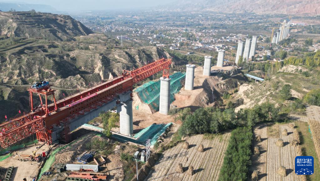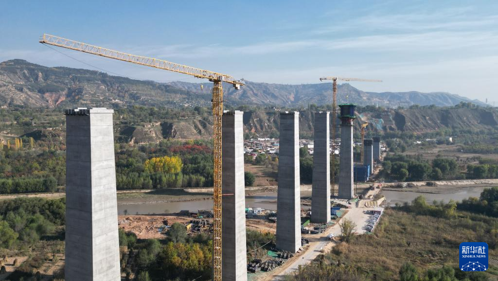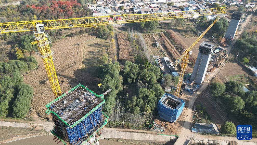 这是10月24日拍摄的位于甘肃临夏境内的兰合铁路4标段北小塬大夏河特大桥墩身施工现场(无人机照片)。新华社发(史有东摄)