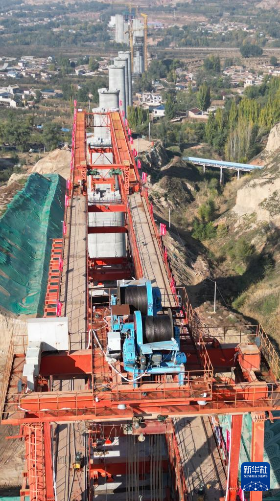 10月24日拍摄的位于甘肃临夏境内的兰合铁路4标段泄湖峡大夏河特大桥胶拼梁架设施工现场(无人机照片)。新华社发(史有东摄)