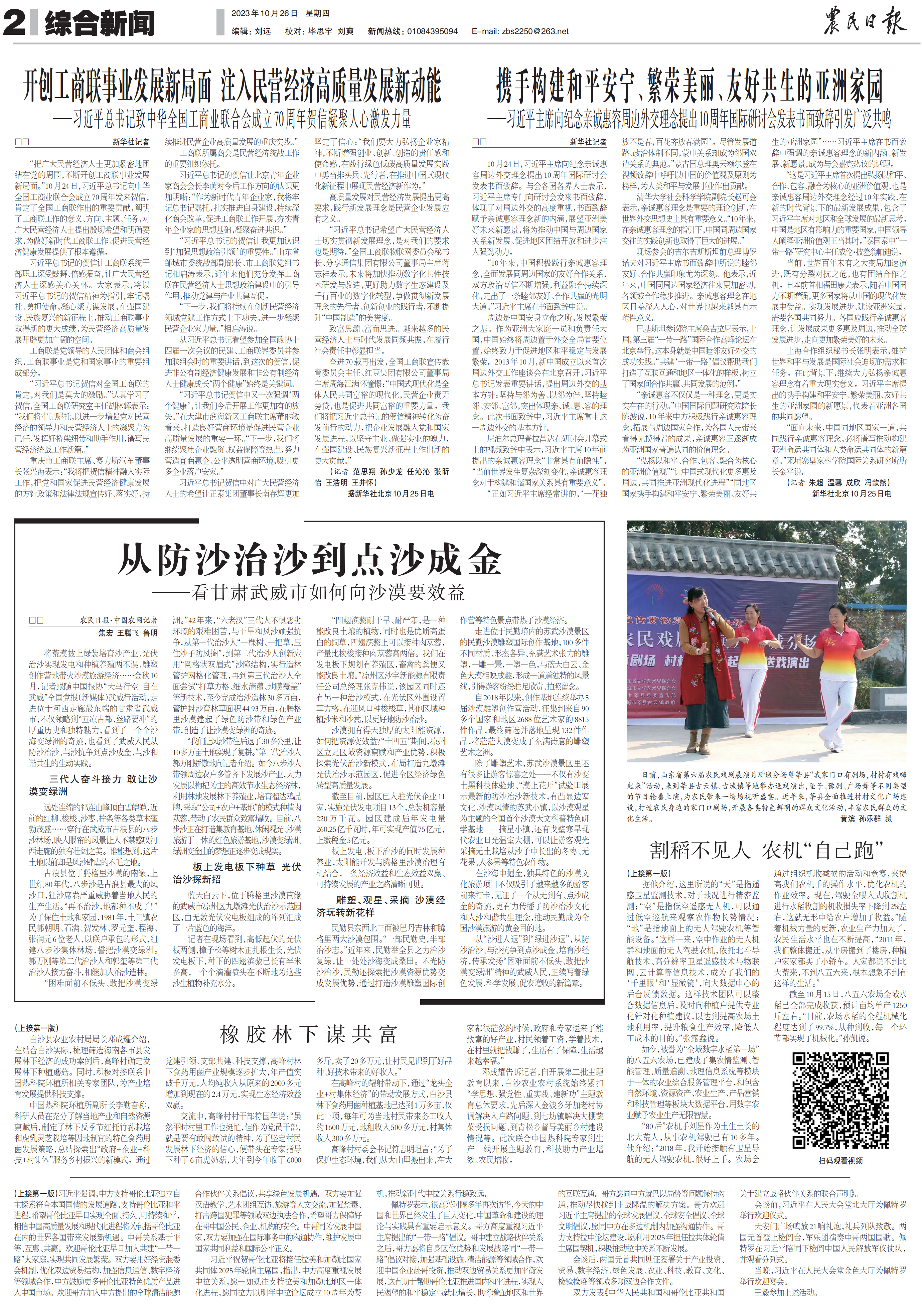 将荒漠披上绿装培育沙产业、光伏治沙实现发电和种植养殖两不误、雕塑创作营地带火沙漠旅游经济……金秋10月,记者跟随中国报协“天马行空 自在武威”全国党报(新媒体)武威行活动,走进位于河西走廊最东端的甘肃省武威市,不仅领略到“五凉古都、丝路要冲”的厚重历史和独特魅力,看到了一个个沙海变绿洲的奇迹,也看到了武威人民从防沙治沙、与沙抗争到点沙成金、与沙和谐共生的生动实践。