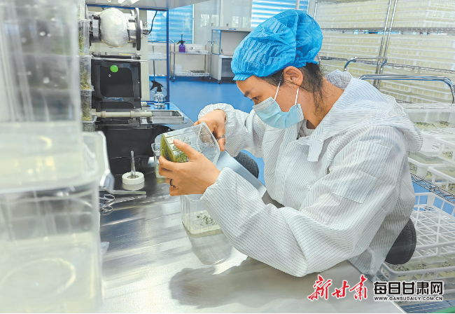 甘肃集华农业科技有限责任公司工作人员正在对马铃薯苗进行茎尖剥离。本文图片除署名外均由新甘肃·甘肃日报记者王朝霞摄