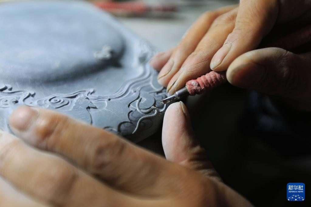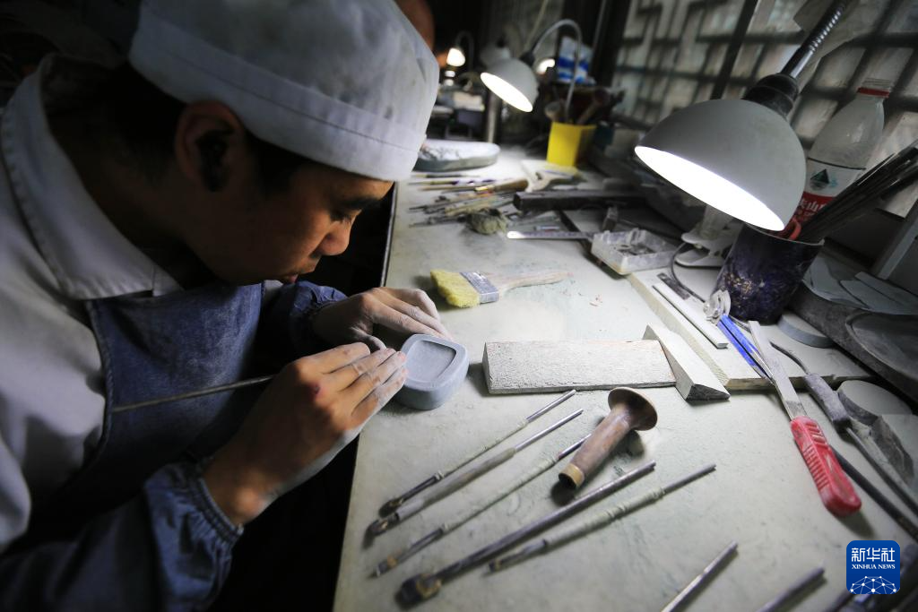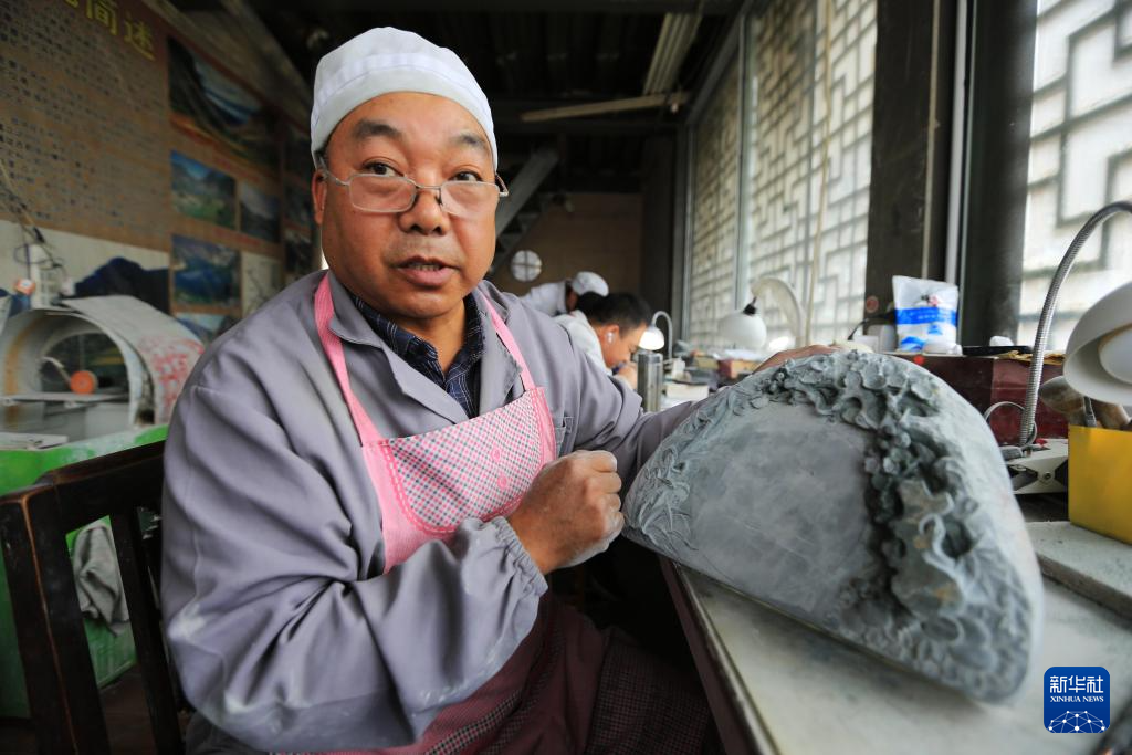10月24日,艺人在甘肃省定西市临洮县洮砚艺术馆雕刻制作洮砚。新华社发(王克贤 摄)