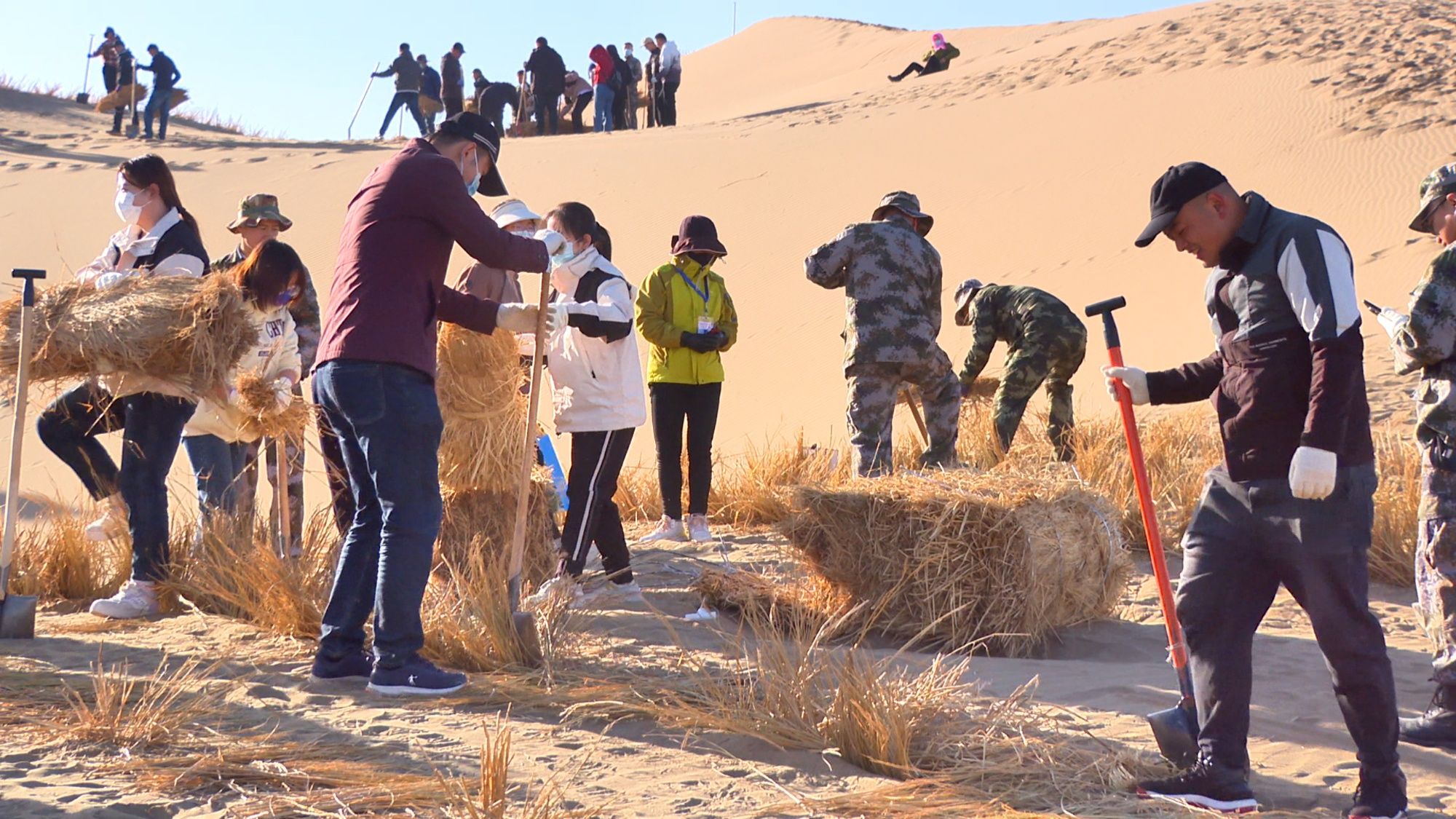 一大早,在位于该县黑泉镇的西沙窝防沙治沙项目现场,来自各单位的干部职工在技术人员的指导下,俯身铺草、挥锹压埋、填沙整型,大家团结协作,干劲十足,一派热火朝天的忙碌景象。
