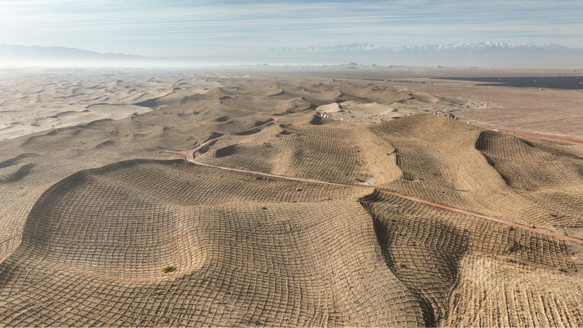 草方格织成的网格状沙障渐次铺开(高台县委宣传部供图)