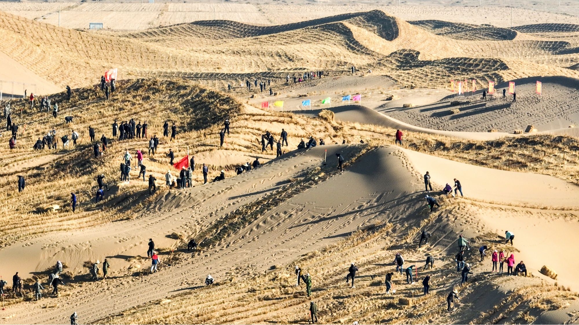 10月31日,甘肃省高台县开展“三北”工程攻坚战秋季义务压沙活动,700多名干部职工用实际行动“织网”锁沙,用汗水构筑生态安全屏障。