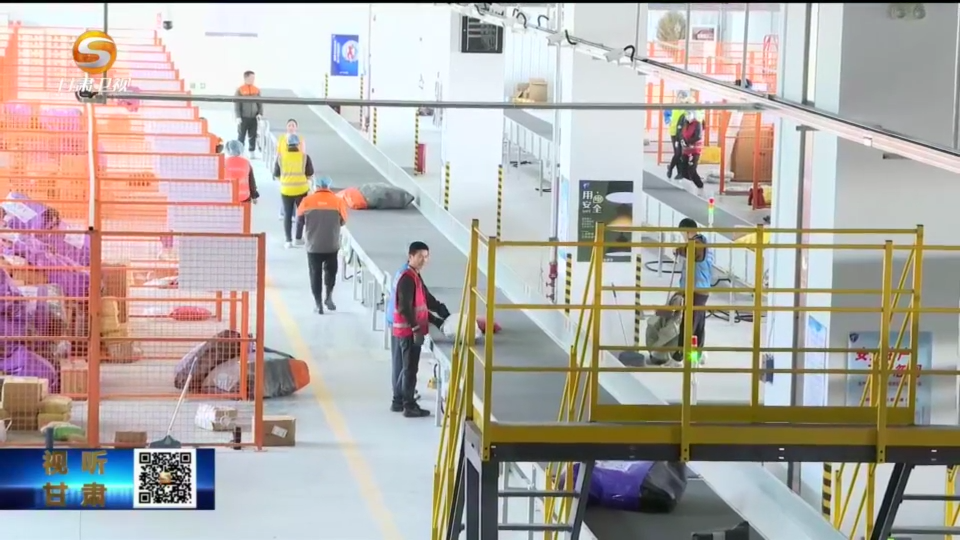 在兰州智慧物流产业园操作场地,一家快递公司全自动化分拣线正在对快递物件进行分拣并分配至各个区域,工人们正忙着做最后的扫描及装车。