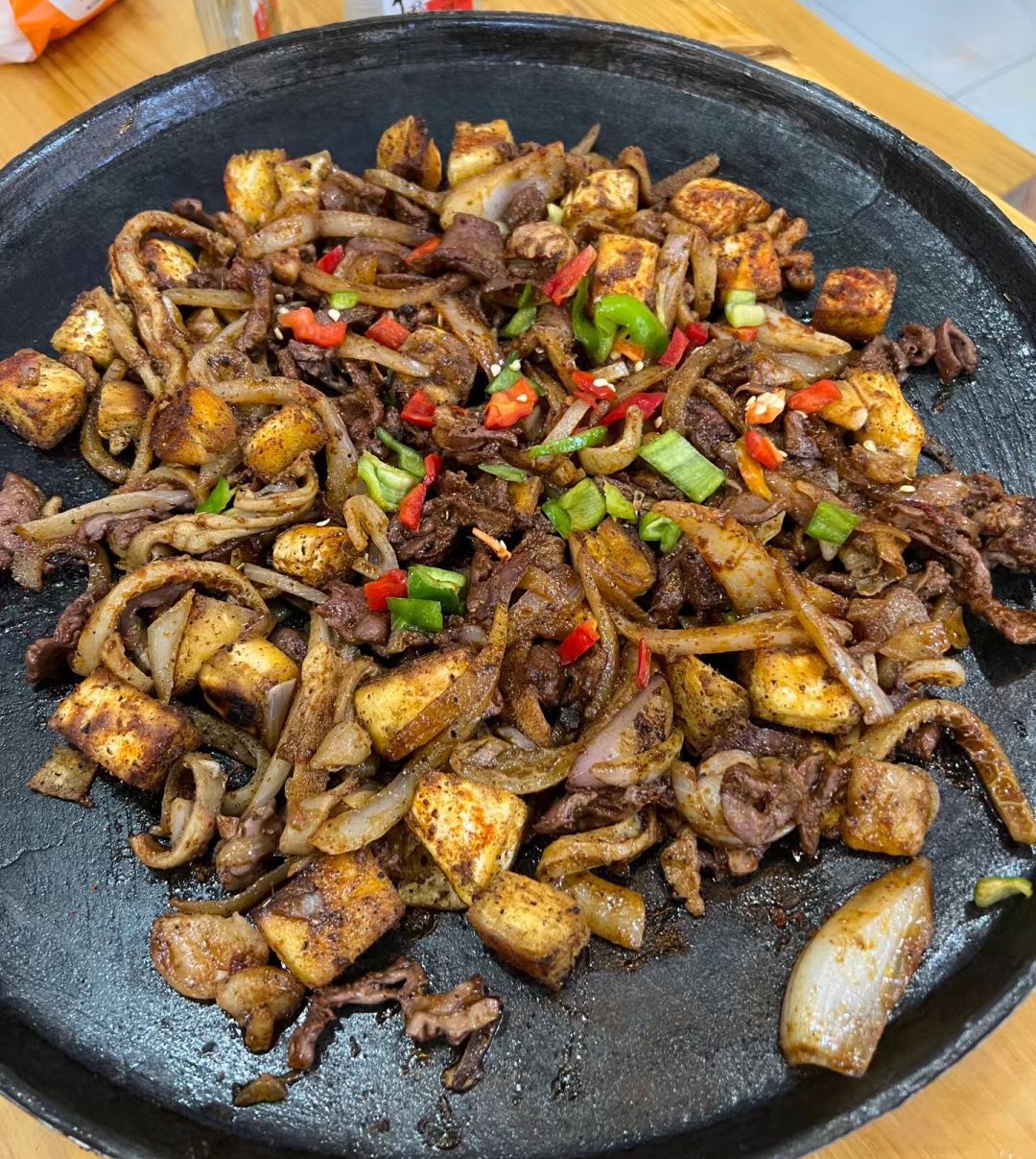 到了晚上,去体验一把必吃项目“山丹炒拨拉”——将切好的羊杂佐以调料葱花、蒜苗下锅,再配上切成小块的饼子用猛火爆炒,连锅端整盘上桌。傍晚的城市有着些许寒意,围坐在锅边,听着盘中食物嗞嗞作响,热乎的一口顺进胃里,暖遍周身,这大概是秋日里独属于张掖这座城带来的满足感吧。