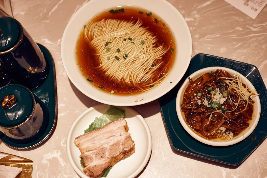 往前稍走几百米,便到了步行街,在这里,你能看到行色匆匆的上班族、悠闲围坐的象棋大师以及和我这般想要了解这座城的行人,或看或听,好不热闹。作为游客的我们目标一致,逛完这个街便要寻得闻名遐迩的“三套车”,看看到底是个什么“车”。进入凉州市场,放眼望去店门上的“武威三套车”比比皆是,随便进了一家店,老板的热情让我对这个城市再次升温,还没坐稳茶已满上,才知这就是三套车的第一套——茯茶,接着上来的行面和卤肉便是其他两套,一口下肚,面条爽滑筋道,卤肉肥而不腻,茯茶醇厚香甜,真的是均衡搭配,异常满足。