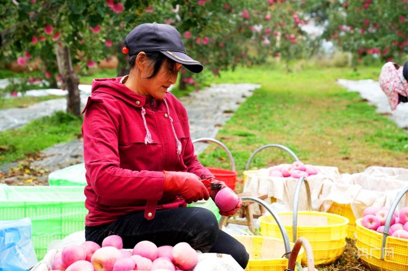 在合水县何家畔镇的果园里,果农正在挑选苹果(央广网发 陆洋 摄)