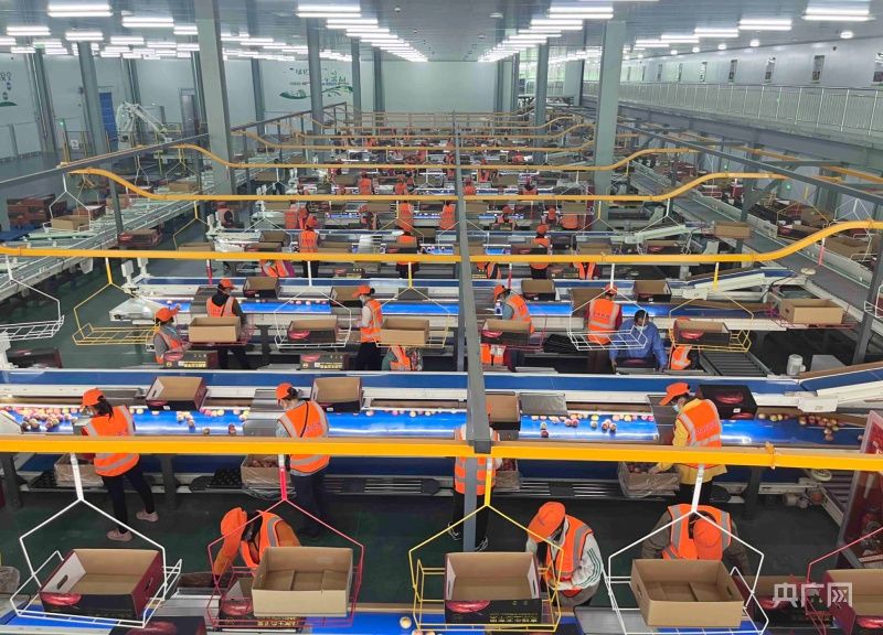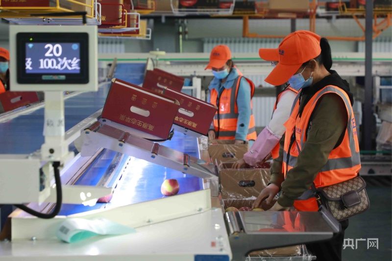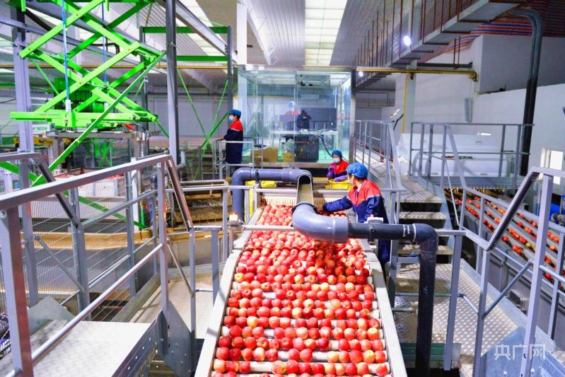 工人在分拣线上包装苹果(央广网发 胡蕊 摄)