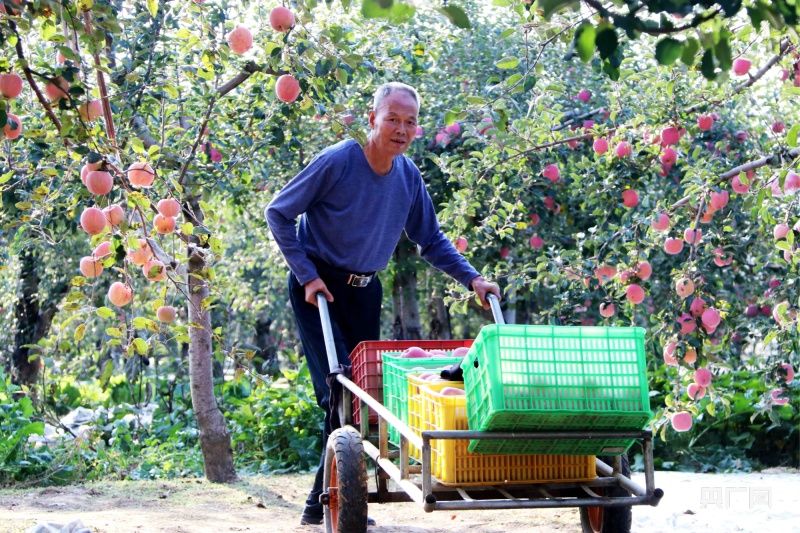 西峰区温泉镇果农在果园里转运苹果(央广网发 盘小美 摄)