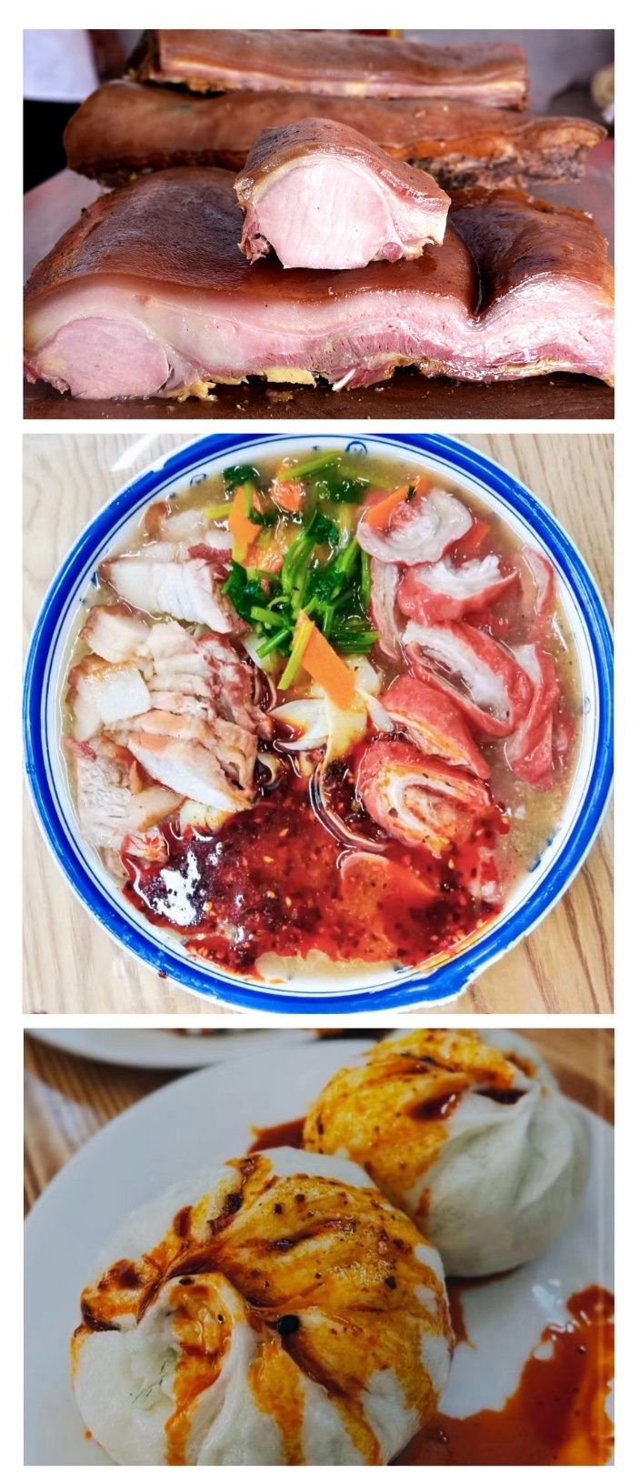 从上到下依次是陇右地区的特色美食:陇西腊肉、肥肠卤肉担担面、腊肉韭菜一颗印包子。(张爱平、蒋鹏 摄)
