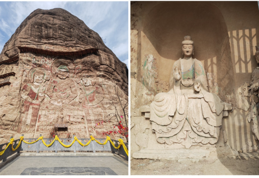 左图是天水市武山县拉梢寺石窟摩崖浅浮雕大佛,右图是麦积山石窟彩塑。(新华社记者 张钦 摄)