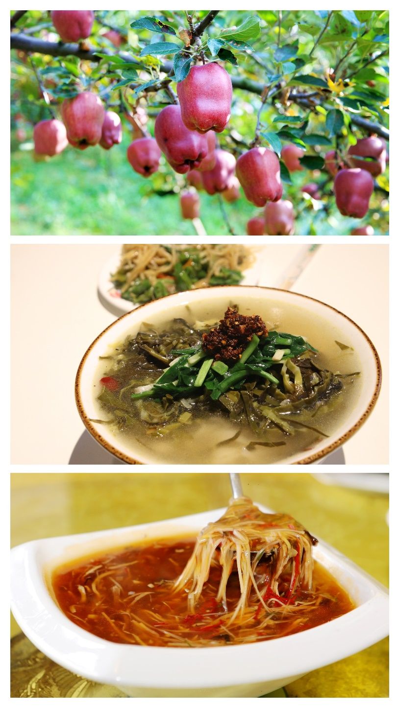 从上到下依次是陇右特色美食:花牛苹果、酸菜浆水面、酸辣肚丝汤。(天水市委宣传部供图)
