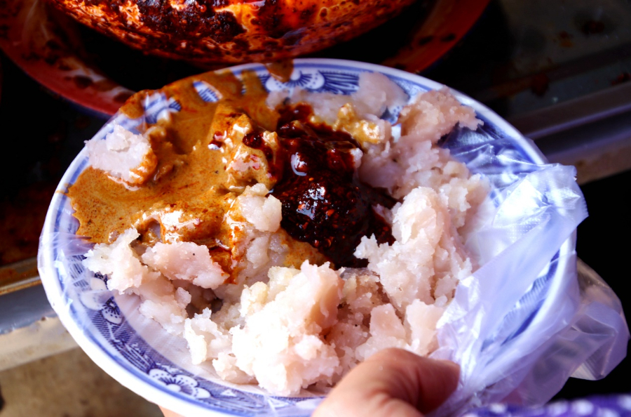 市面上,众多店家将荞面加水入锅、收汁变稠后形成呱呱。每当有食客光顾,店主就熟练地将呱呱捏碎,撒上盐、醋、酱油、芥末、蒜泥、芝麻酱等十多种调料,再浇上麻辣烫同款“灵魂汁子”——油泼辣子,令人垂涎的美食就上桌了。