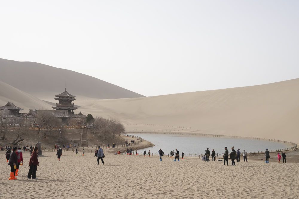 游客在敦煌市鸣沙山月牙泉景区参观(3月16日摄)。新华社记者 张智敏 摄