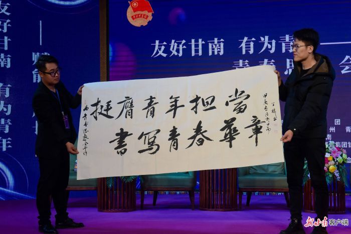书法老师现场创作“挺膺青年担当,书写青春华章”的作品激励甘南青年奋发有为。