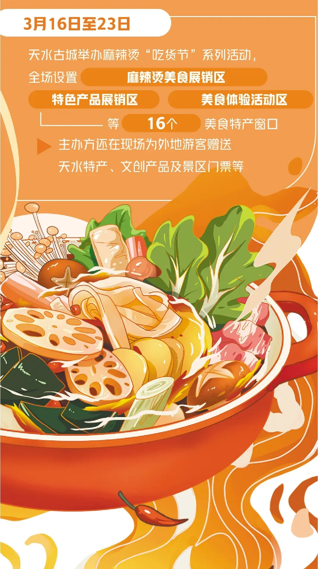 连日来,天水麻辣烫热度持续攀升,当地保障服务也在不断优化。为满足更多游客需求,3月16日至23日,在天水古城举办麻辣烫“吃货节”系列活动,全场设置麻辣烫美食展销区、特色产品展销区、美食体验活动区等16个美食特产窗口,主办方还在现场为外地游客赠送天水特产、文创产品及景区门票等。同时,天水市秦州区筛选了全区39家口碑较好的麻辣烫经营户,在羲皇大道东煜广场设立麻辣烫一条街,从3月16日筹备搭建到3月18日开始营业,仅用了2天时间。3月17日起,天水市委、市政府等党政机关大院的停车位、厕所免费向外地游客开放。