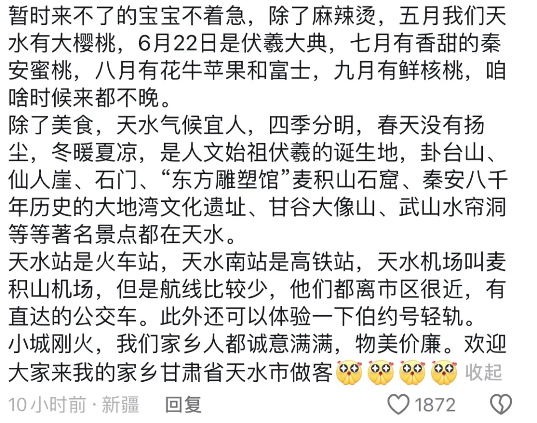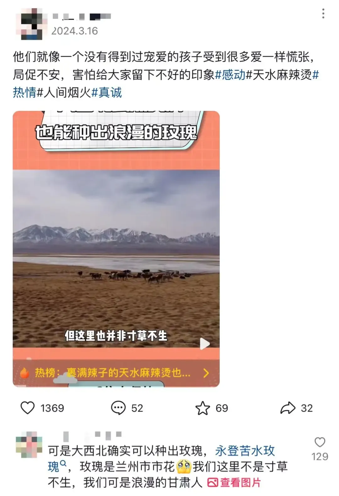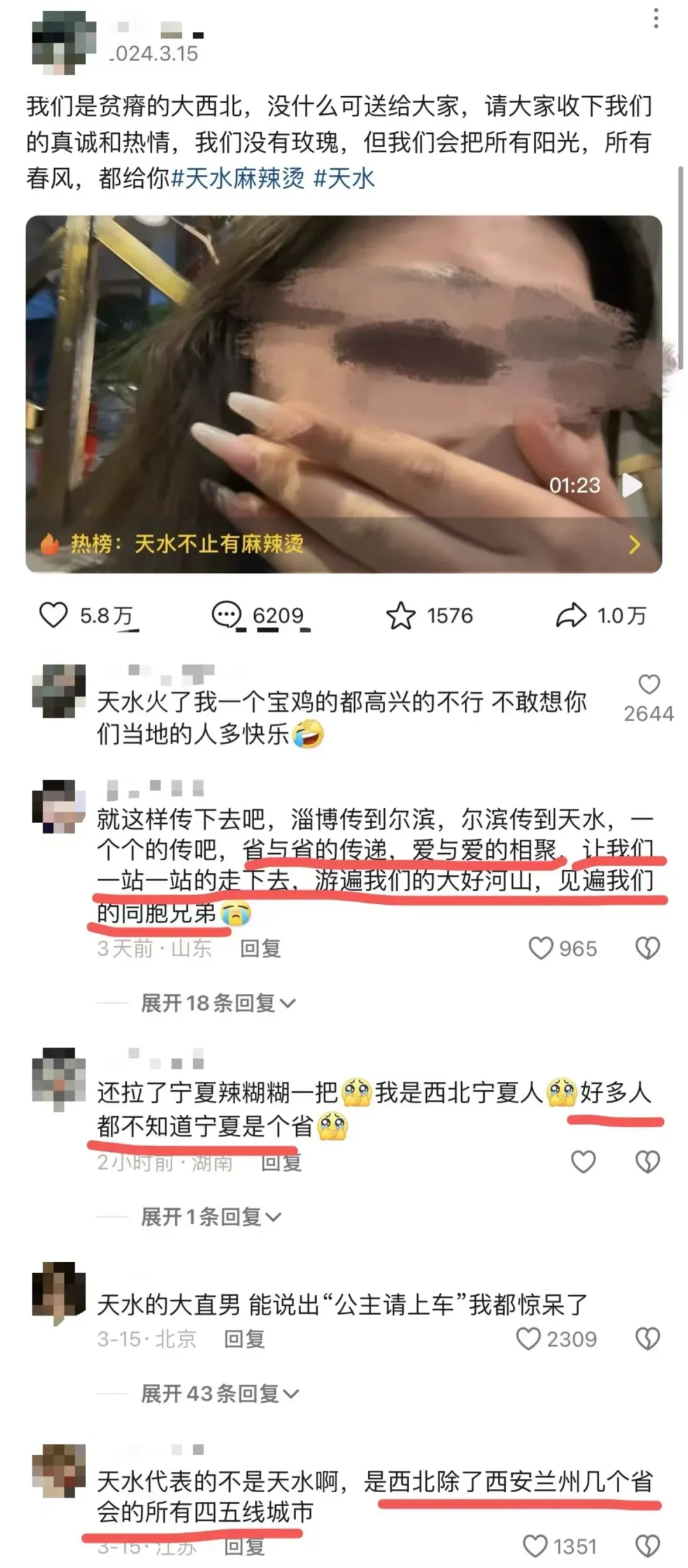 你甚至能在天水麻辣烫的评论区,看到同为大西北的其他省份的人,也在为天水感到由衷地高兴。