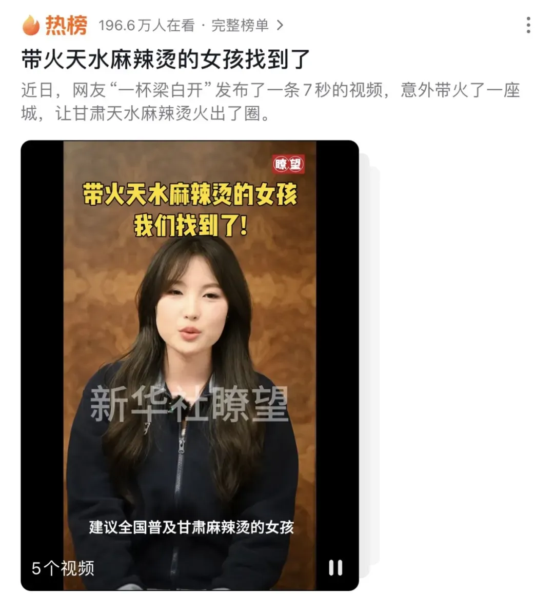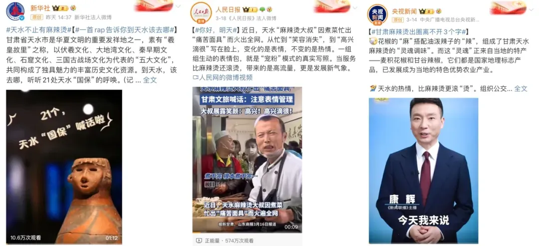 新华社、人民日报、央视新闻等官媒,都齐刷刷下场为这股天水热添砖加瓦。