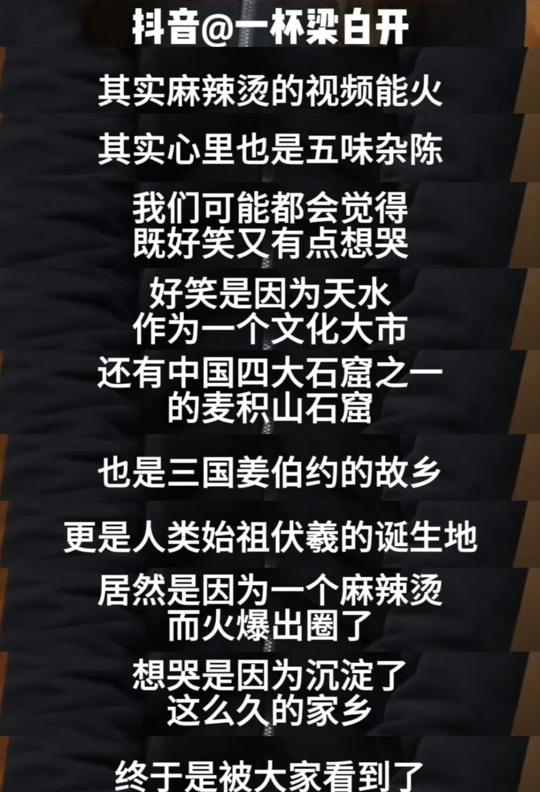 “好笑是因为,觉得天水作为文化大市,既有中国四大石窟之一的麦积山石窟,也是三国姜伯约的故乡,更是人类始祖伏羲的诞生地……可这些,竟然比不上一碗麻辣烫的影响力大。