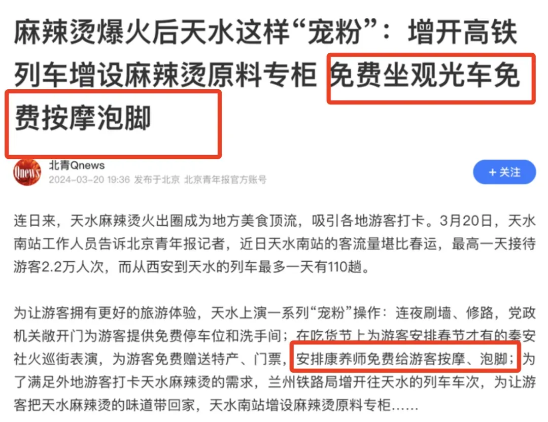 最离谱的,是天水还给外地游客直接安排上了康养师,免费按摩、泡脚。