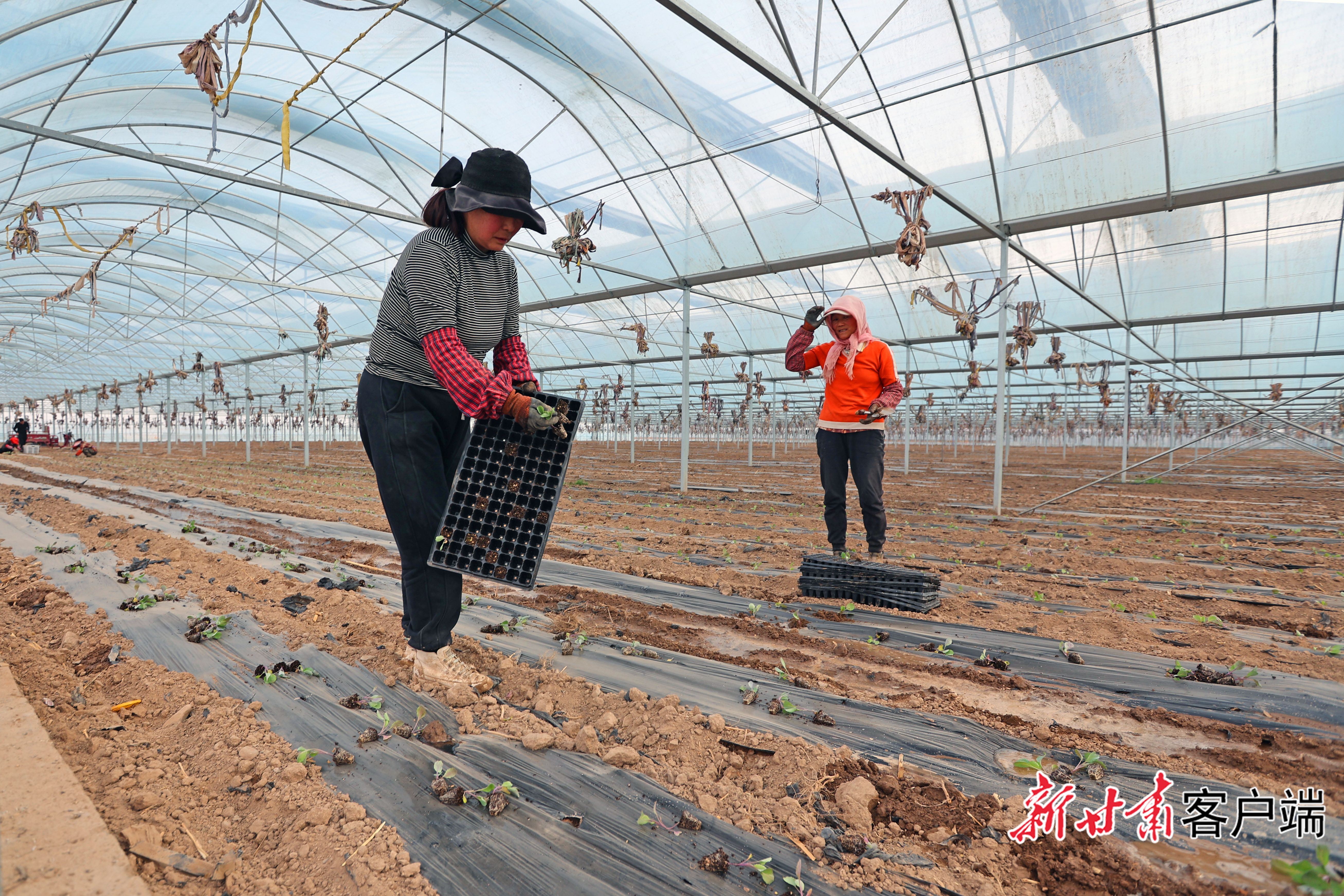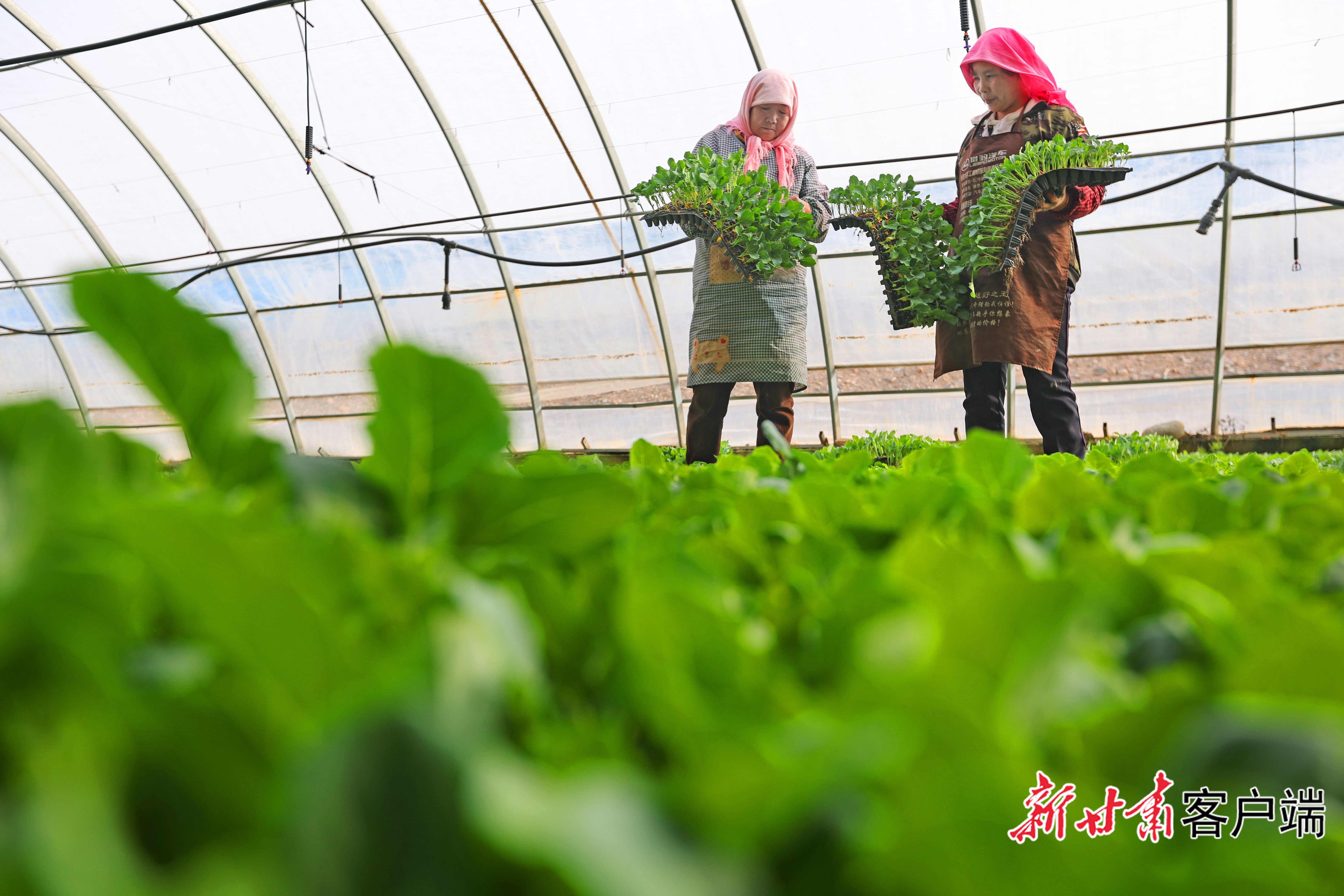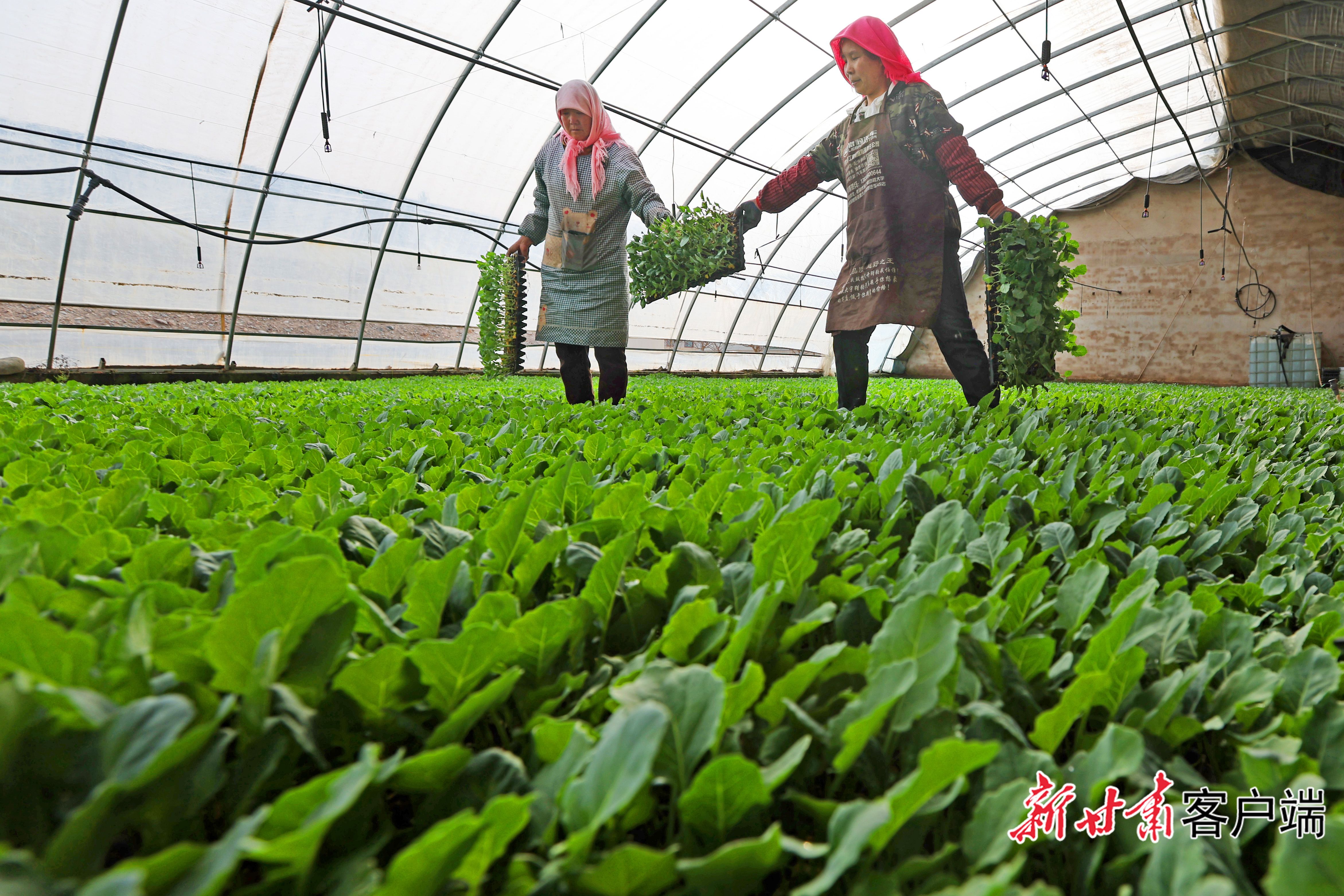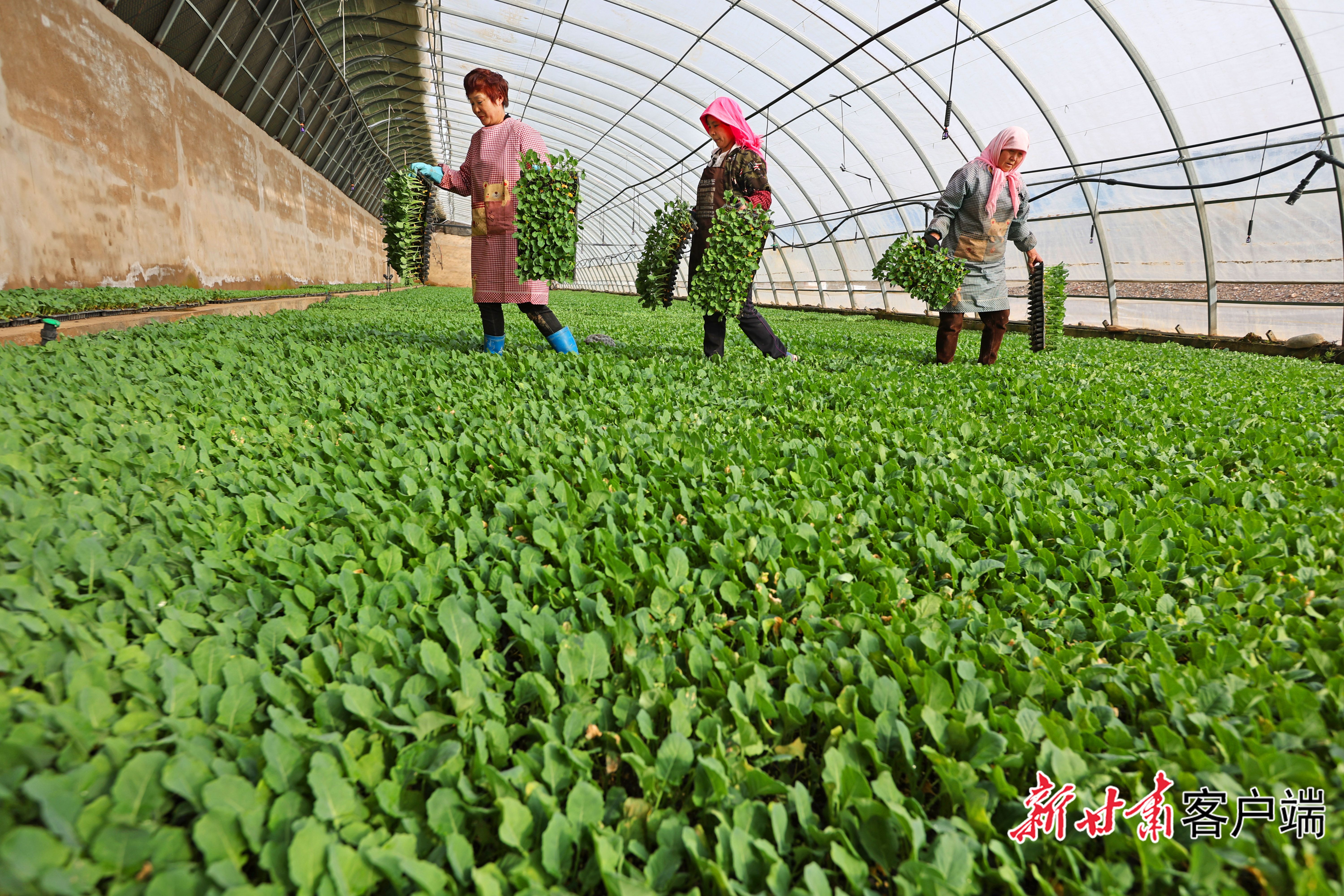 3月22日,临泽县沙河镇供销百惠果蔬专业合作社育苗中心辣椒苗培育大棚内,菜农正在进行蔬菜育苗、管护和移栽。