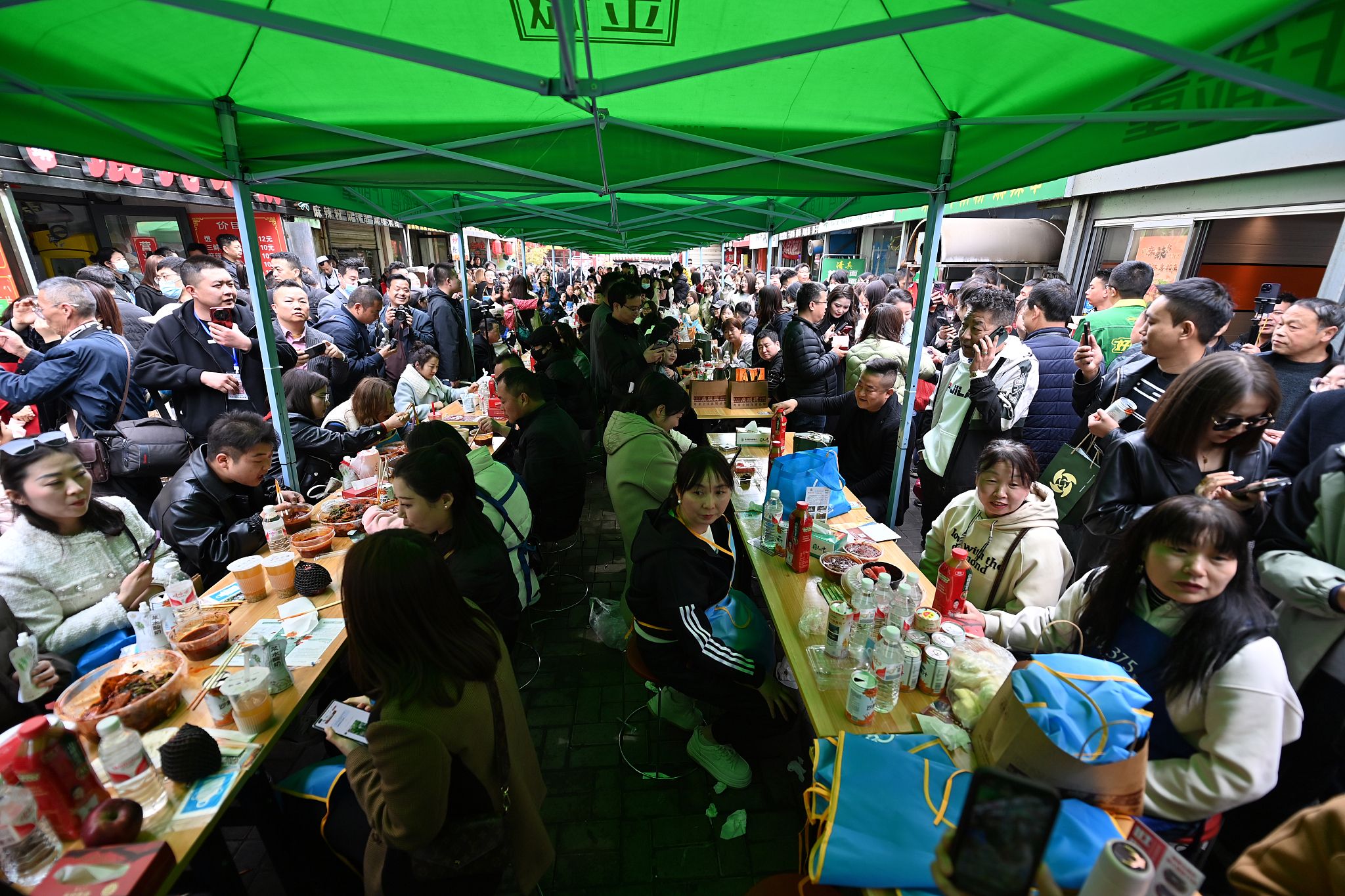 2024年3月14日,甘肃天水,游客品尝麻辣烫。资料图