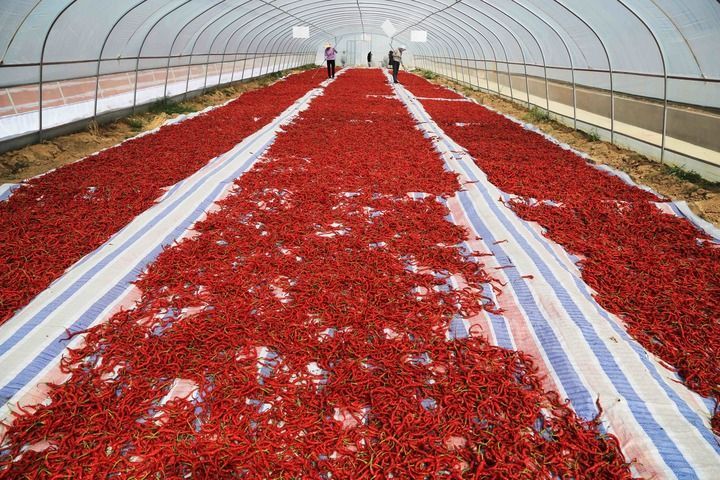 2021年9月19日,村民在甘肃省天水市甘谷县安远镇辣椒基地晾晒辣椒。王克贤/摄