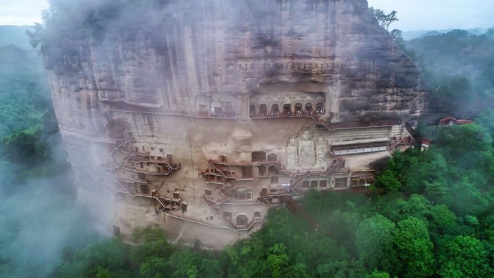 这是2023年5月31日拍摄的烟雨笼罩下的麦积山石窟(无人机照片)。新华每日电讯记者 马希平/摄