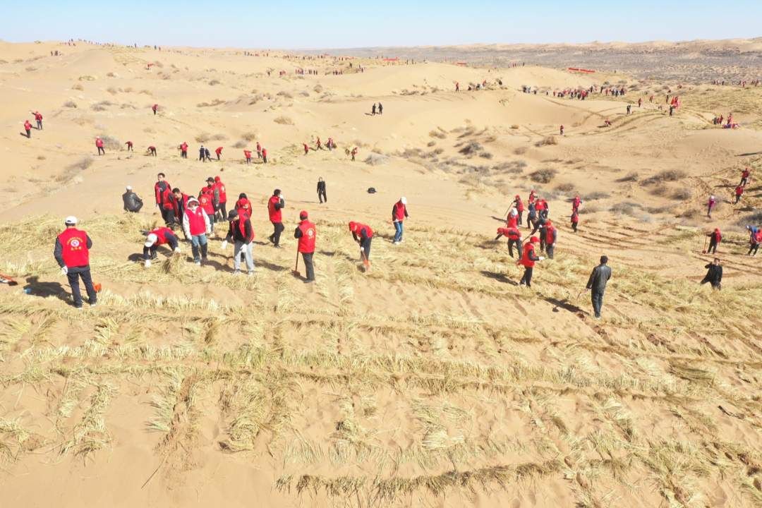 在压沙现场,干部群众在林草技术人员指导下,扶犁开沟,挥锹压埋,填沙整型,一块块两米见方的草方格沙障从无到有,在连绵起伏的沙丘上渐次铺开,与近年来集中埋压的草方格沙障连在一起,形成一张巨大的网锁住沙漠。