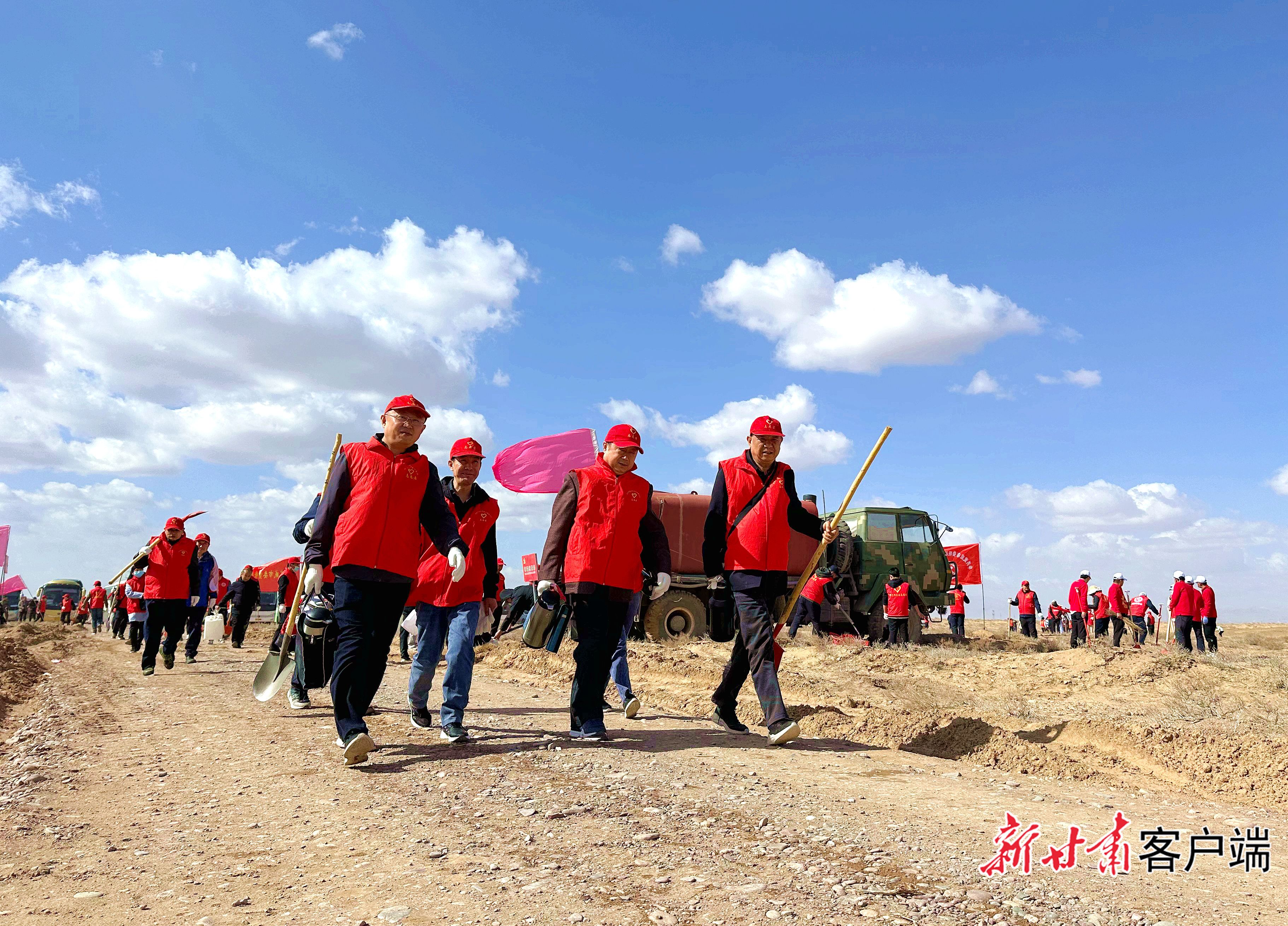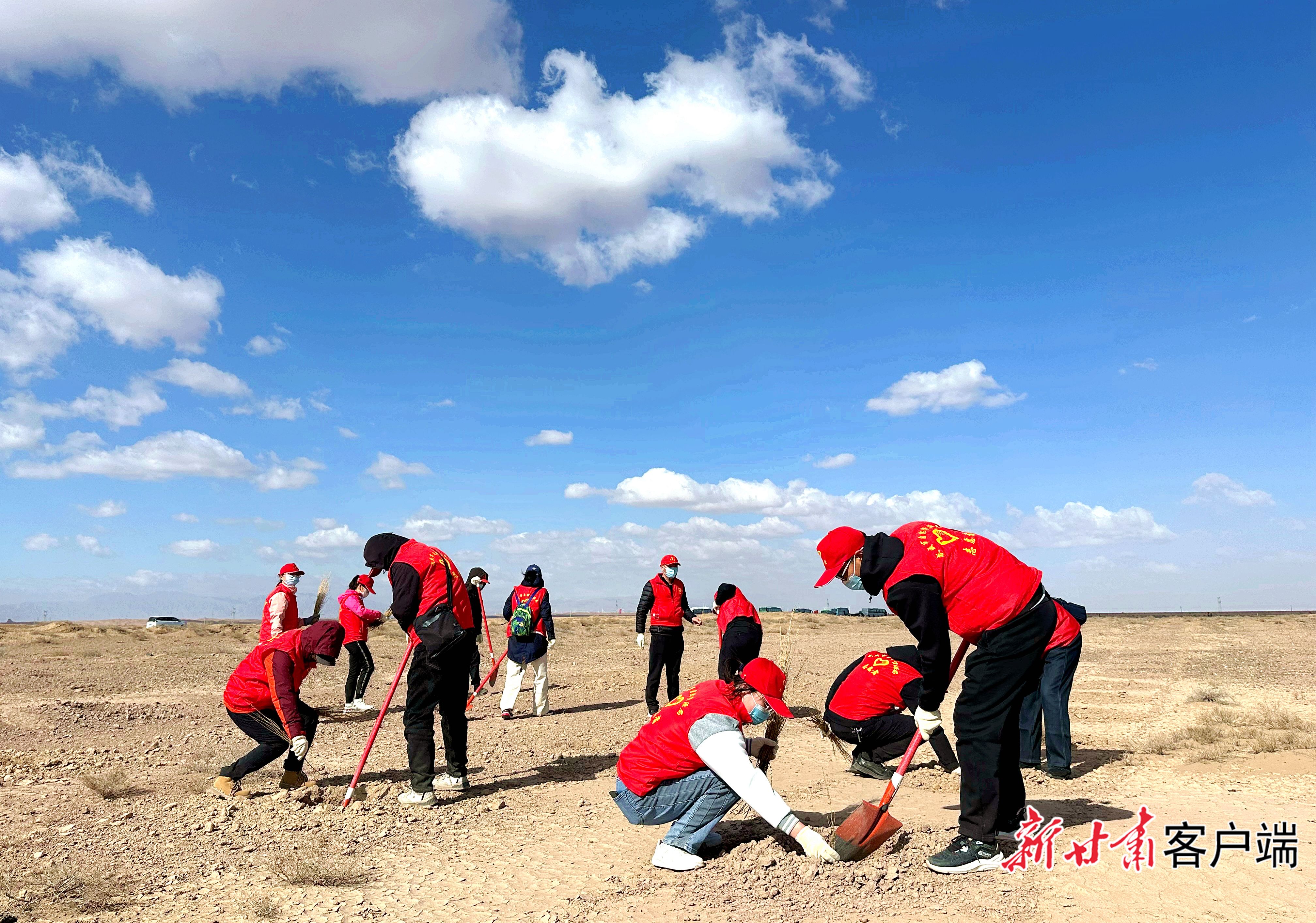 干部职工栽植梭梭苗。新甘肃·甘肃日报记者 金奉乾摄