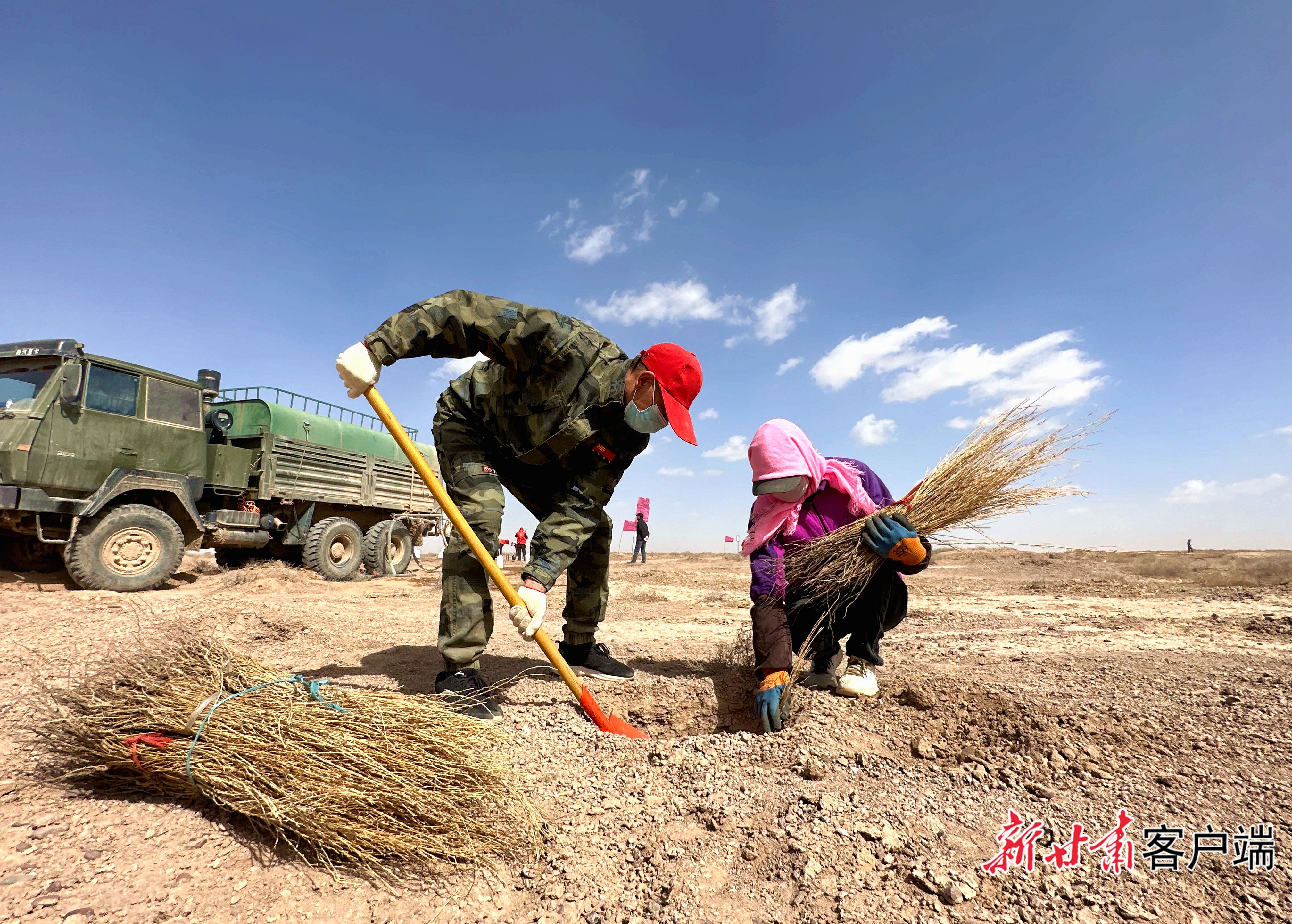 在民勤县青土湖栽桩石压沙区域,参加压沙的干部群众扶犁开沟、俯身铺草、挥锹填沙,分工明确、干劲十足。在大家的共同努力下,一个个草方格沙障从无到有渐次铺开,牢牢锁住了沙丘。