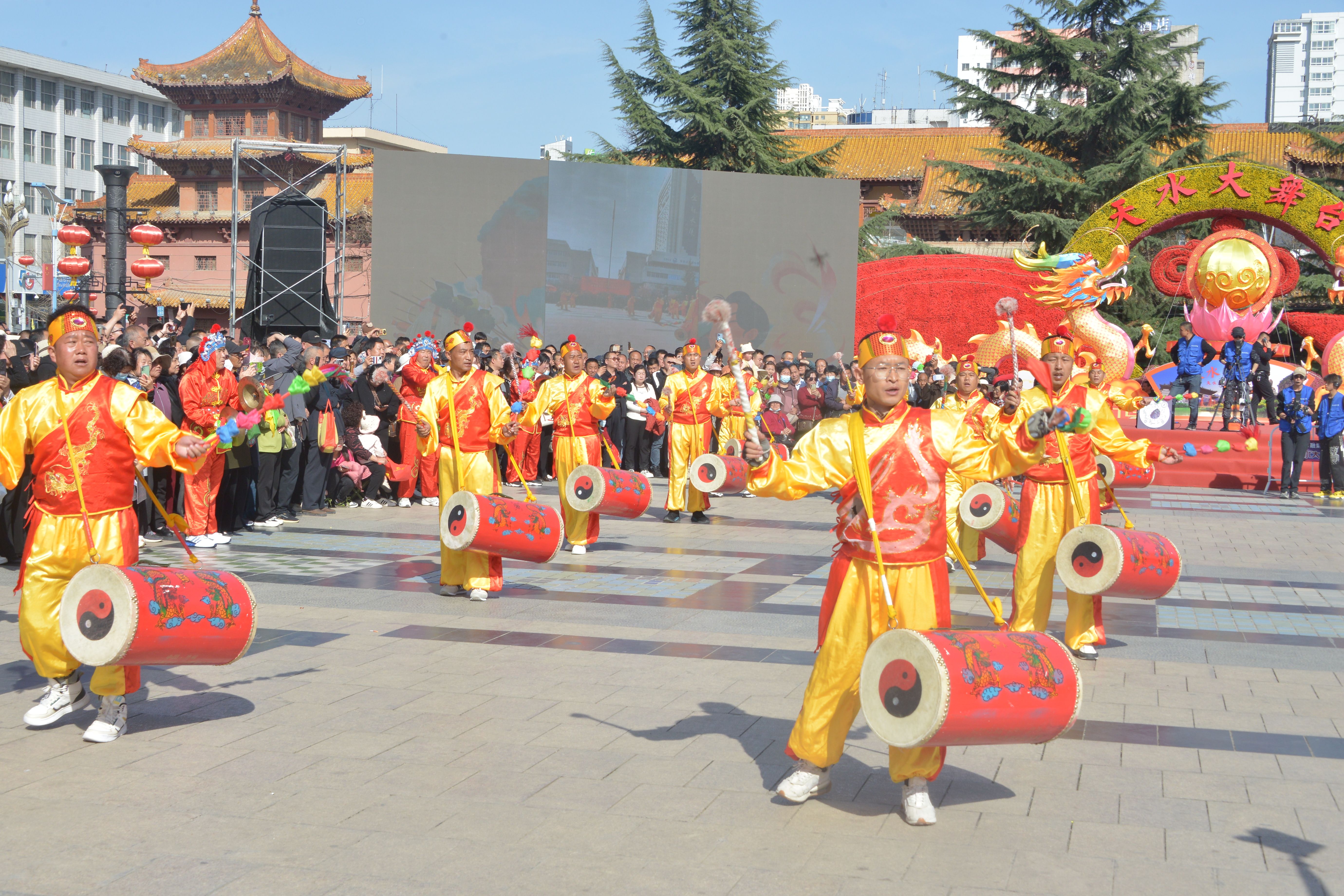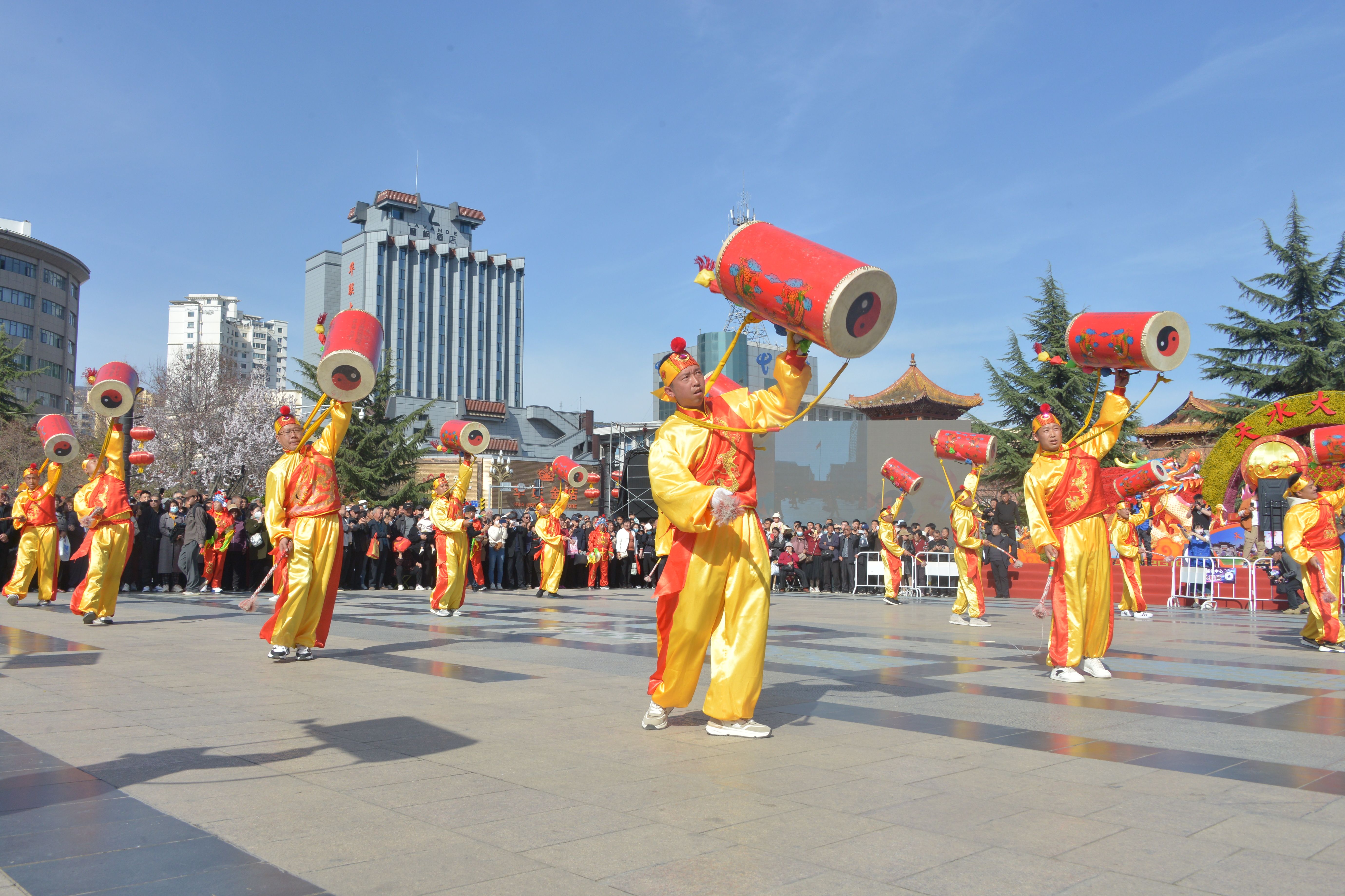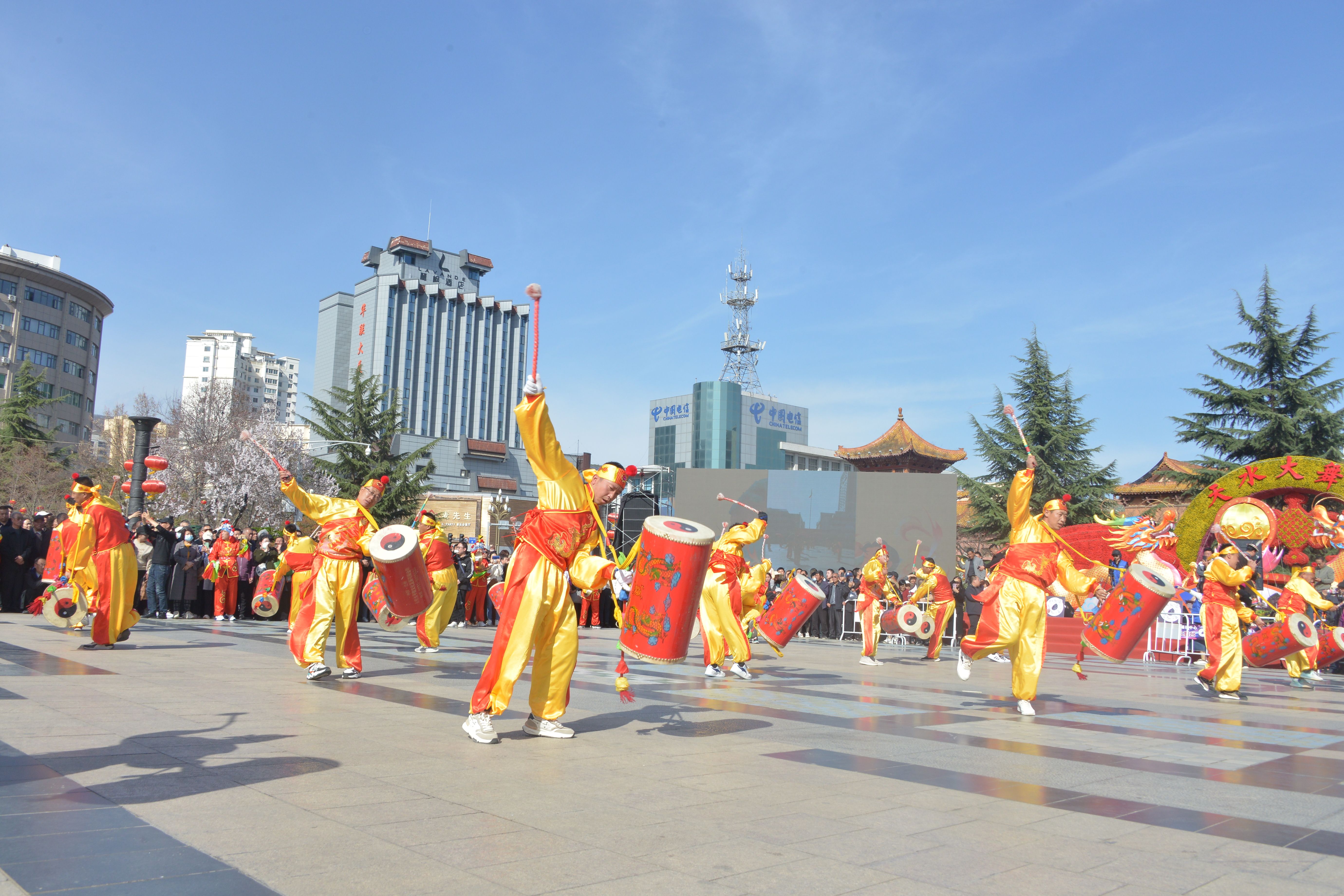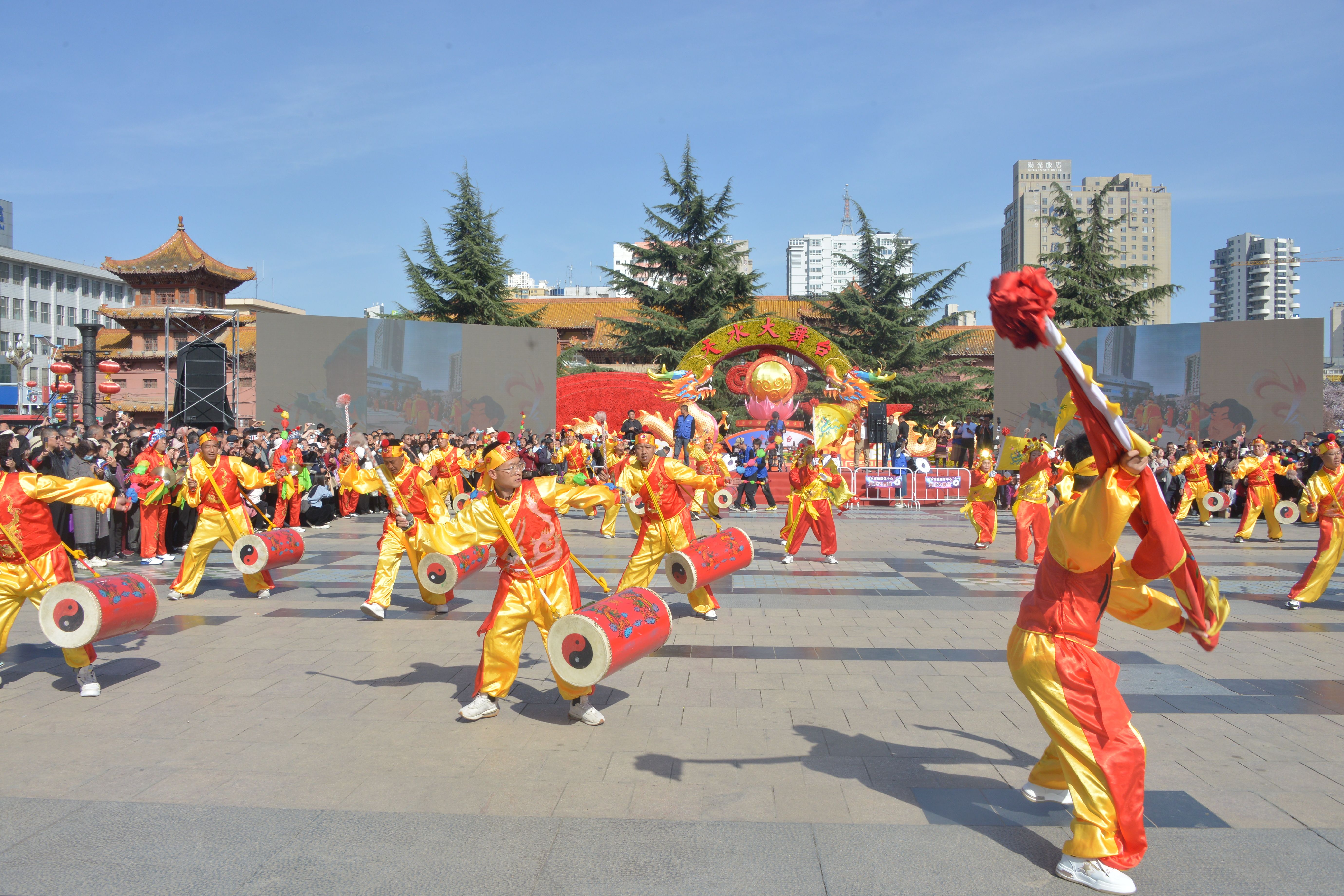 3月28日,兰州新区助力天水麻辣烫开展非遗展演和美食展销活动首场重头戏——新区太平鼓在春意盎然的天水市秦州区龙城广场和伏羲庙广场敲响铿锵鼓点,为羲皇故里以及全国各地品味天水麻辣烫的观众呈现了一场视觉与听觉的双重盛宴。