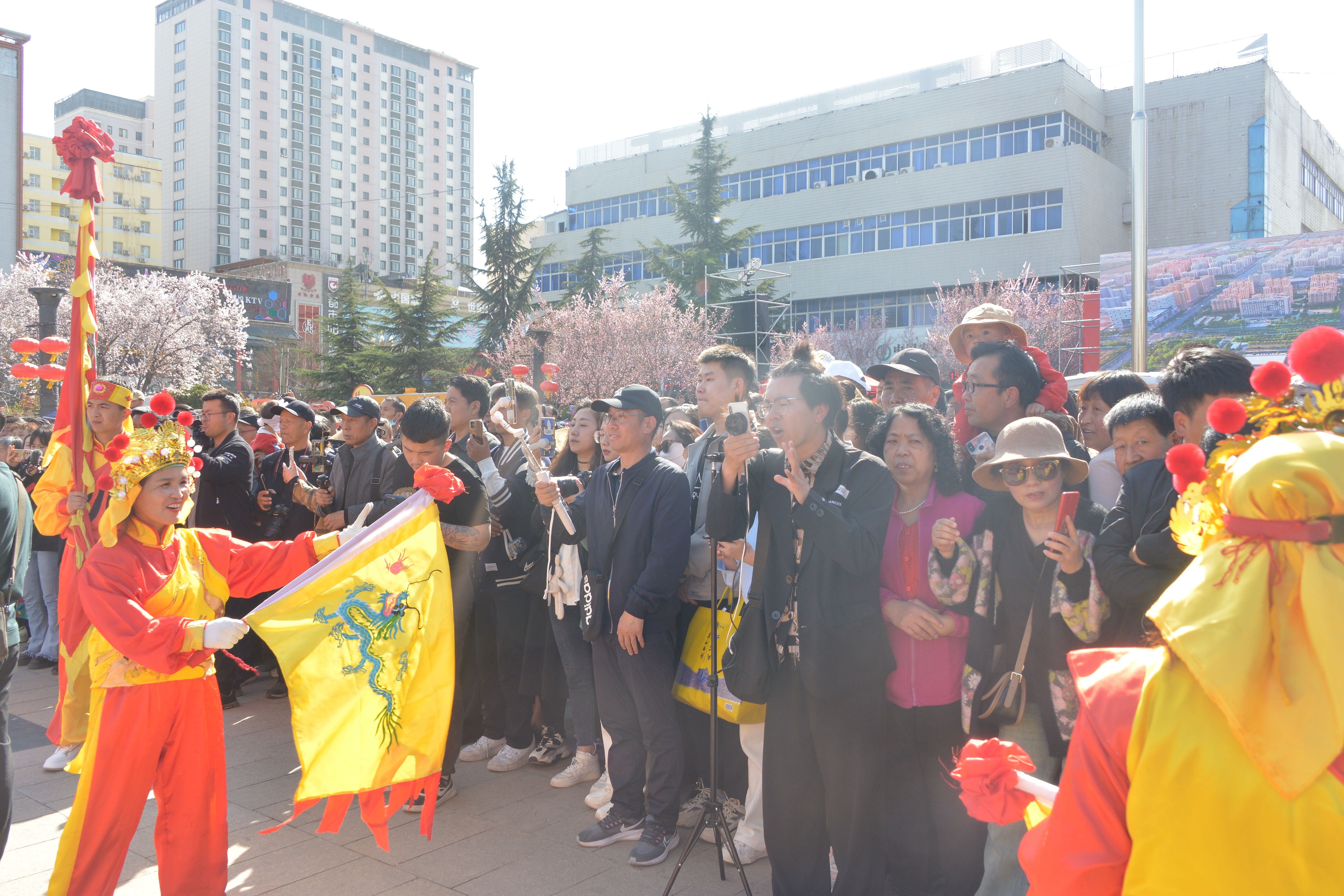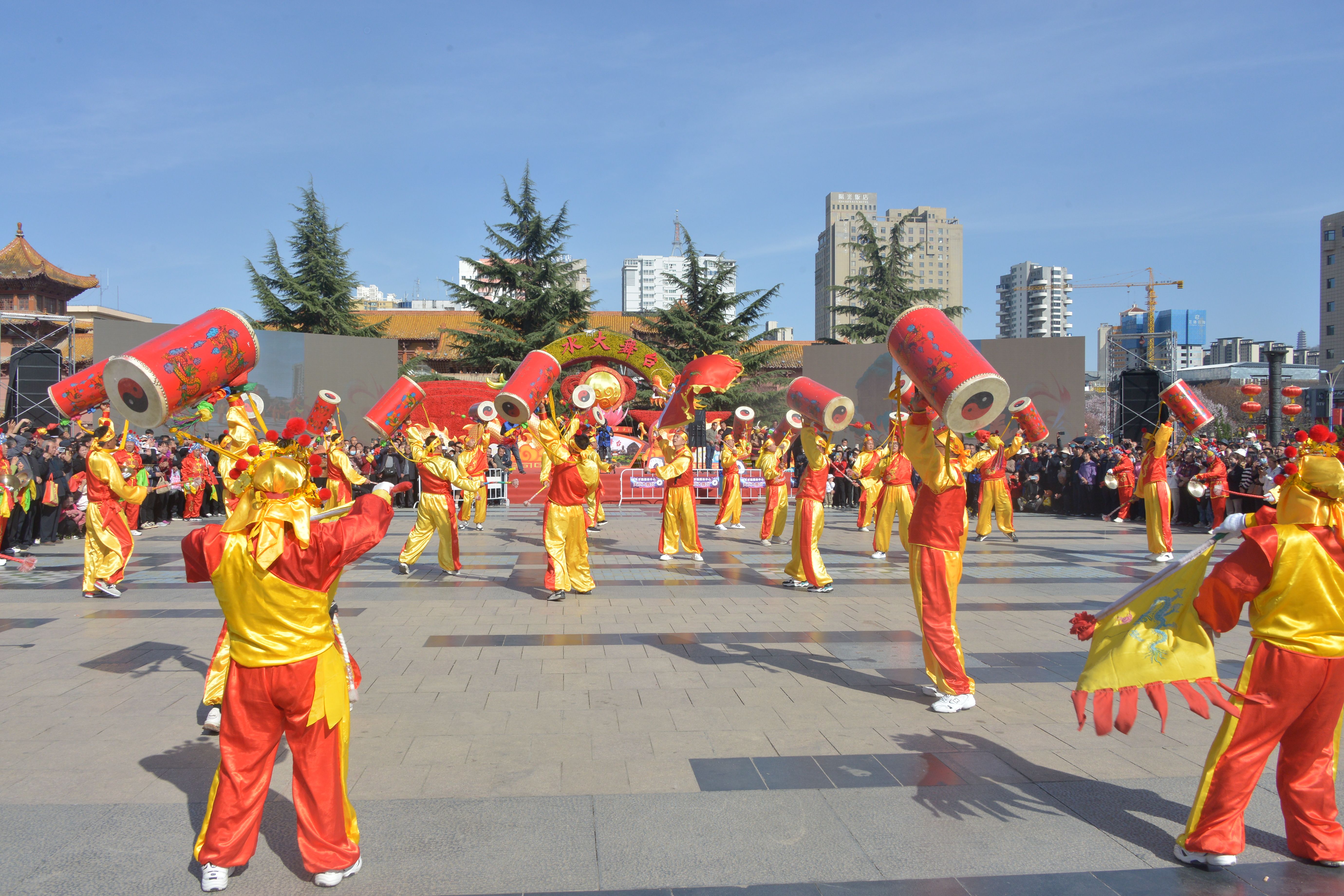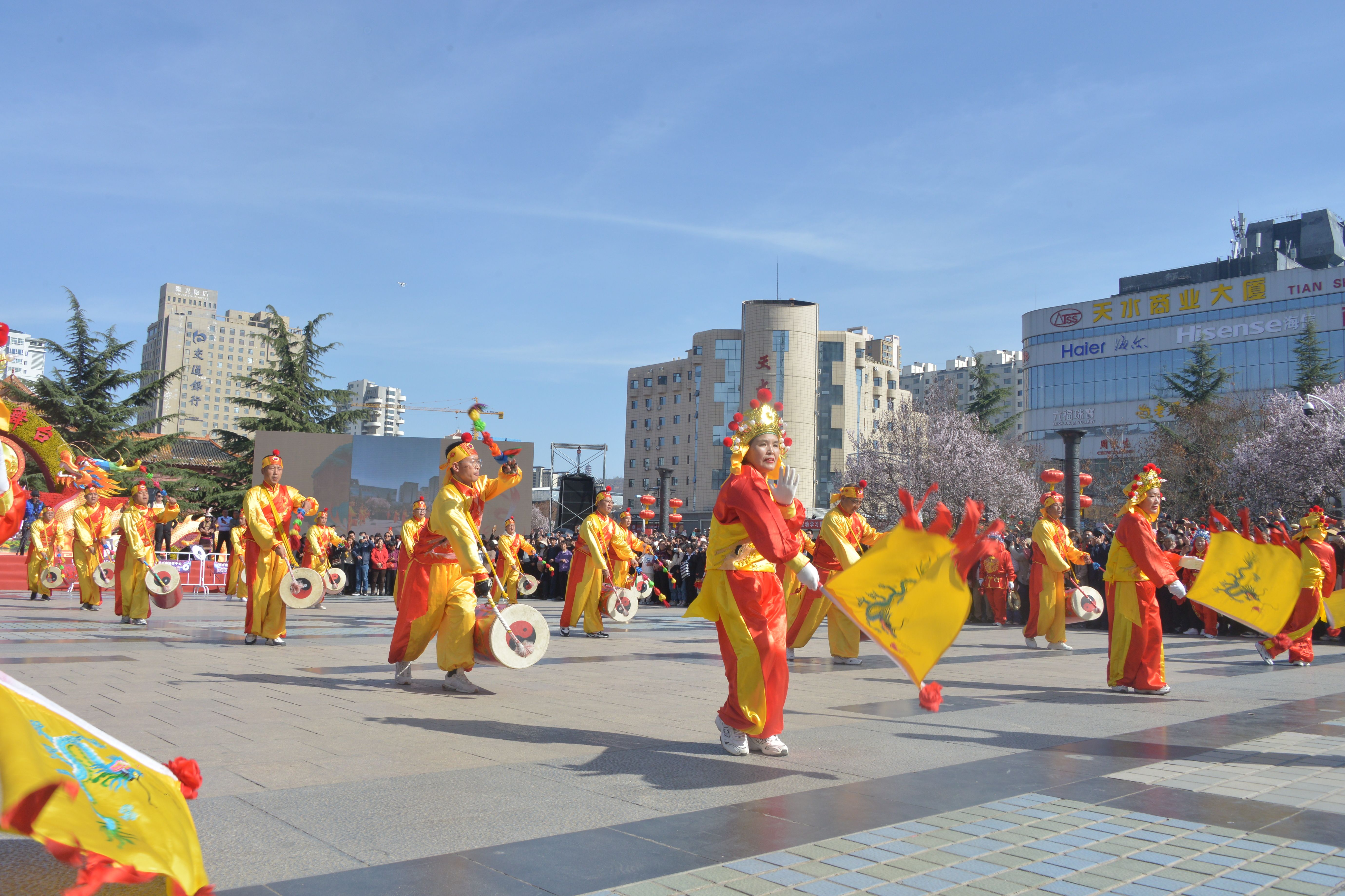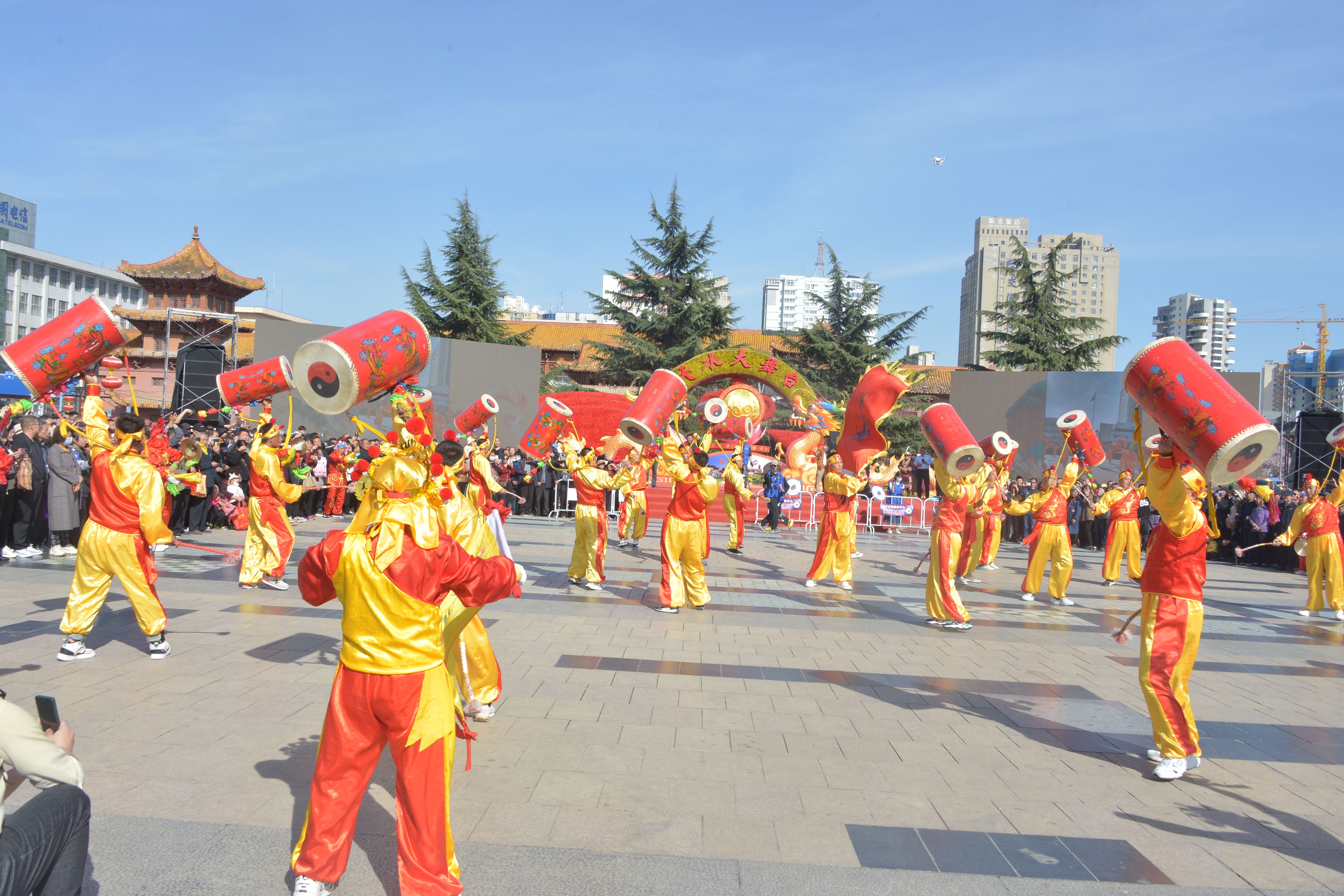3月28日,兰州新区助力天水麻辣烫开展非遗展演和美食展销活动首场重头戏——新区太平鼓在春意盎然的天水市秦州区龙城广场和伏羲庙广场敲响铿锵鼓点,为羲皇故里以及全国各地品味天水麻辣烫的观众呈现了一场视觉与听觉的双重盛宴。