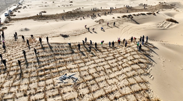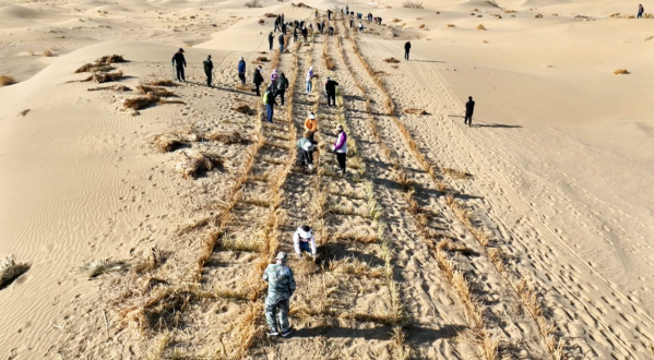 一大早,在西沙窝义务治沙示范点上,黑泉镇的200多名干部职工群众走进沙漠,在林草部门技术人员指导下,划线背草、俯身铺草、挥锹压埋……光秃秃的沙丘上,整齐的草方格一排排、一片片不断向沙漠腹地延伸,将连绵不绝的黄沙牢牢锁在了原地。“开展义务压沙活动是我们改善生态环境、建设美好家园的实际行动,希望通过此次活动能够带动更多的人参与到防沙治沙工作中来,让我们的绿色家园变得更加美好。”正在和同时压沙的黑泉镇干部张立翔说。