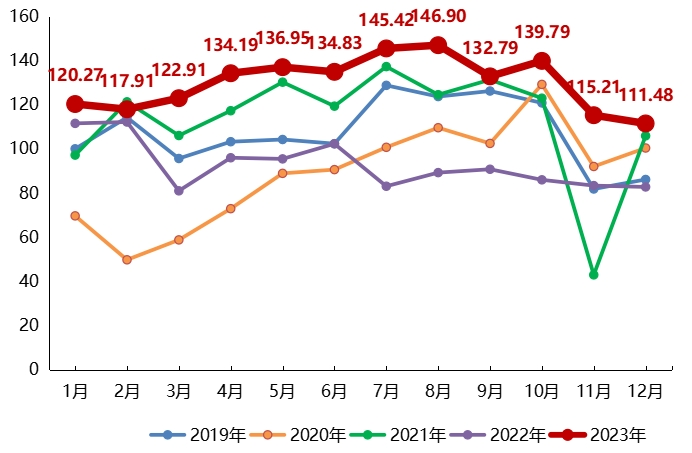 2023年甘肃乡村旅游市场回暖复苏,市场热度持续攀升,消费热度总指数均值为129.89点,较2019年增长了21.13%,与2022年指数均值92.78点相比上涨了近40%。其中,2023年市场消费潜力度分指数均值为111.81点,较去年增长9.8%,较2019年增长21.71%。透过2023年指数的变化,发现甘肃乡村旅游呈现“高开高走、高位运行”的特征。