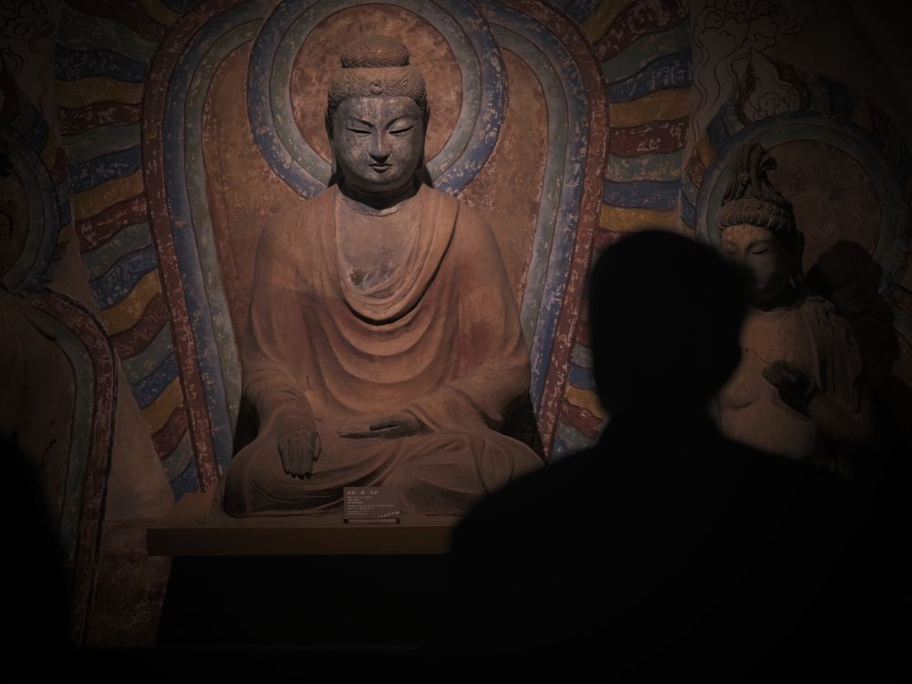 3月11日,游客在甘肃省博物馆观看展出的唐代佛像。新华社记者赵宇摄
