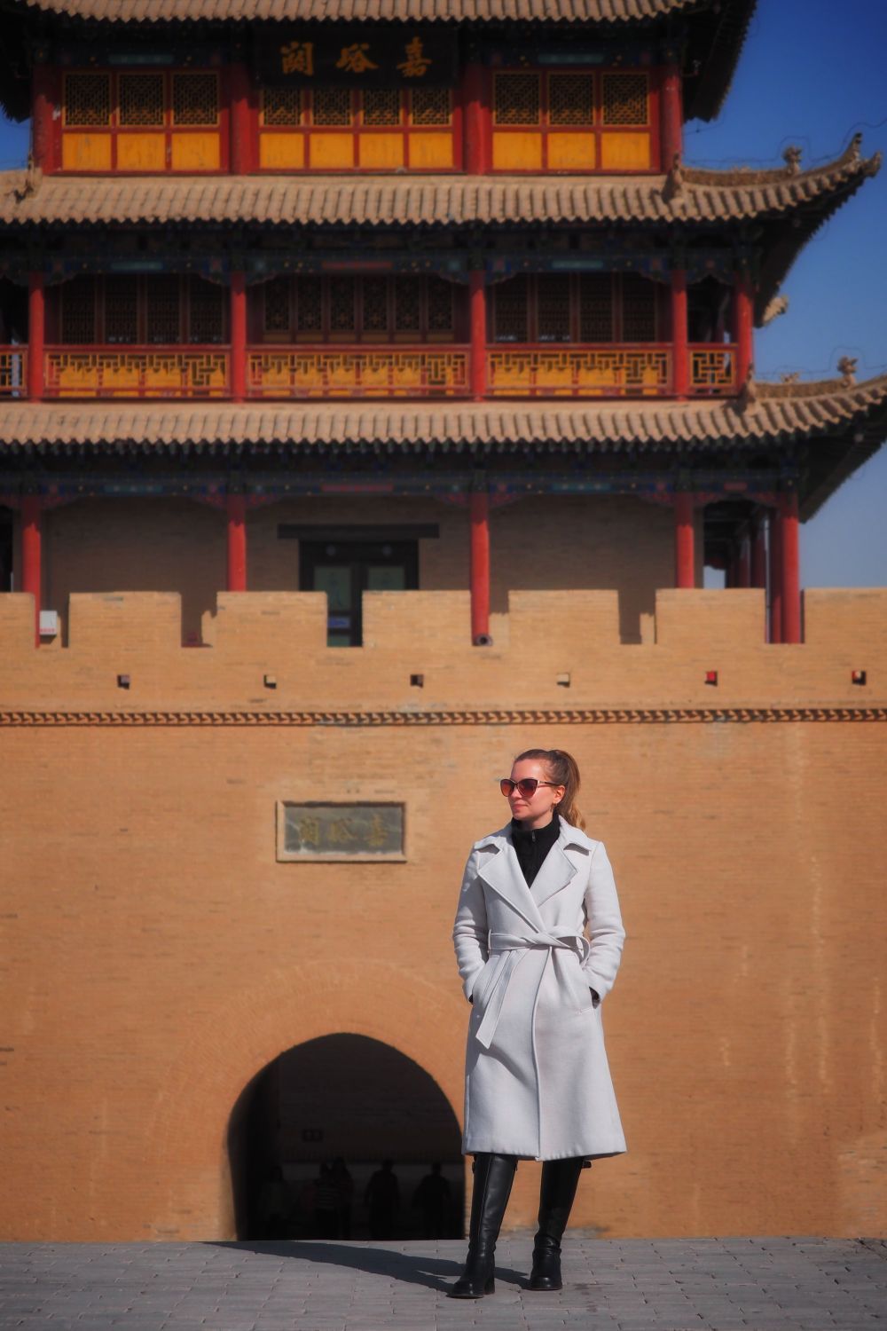 3月14日,新华社外籍记者达莎在甘肃嘉峪关城楼前。新华社记者赵宇摄