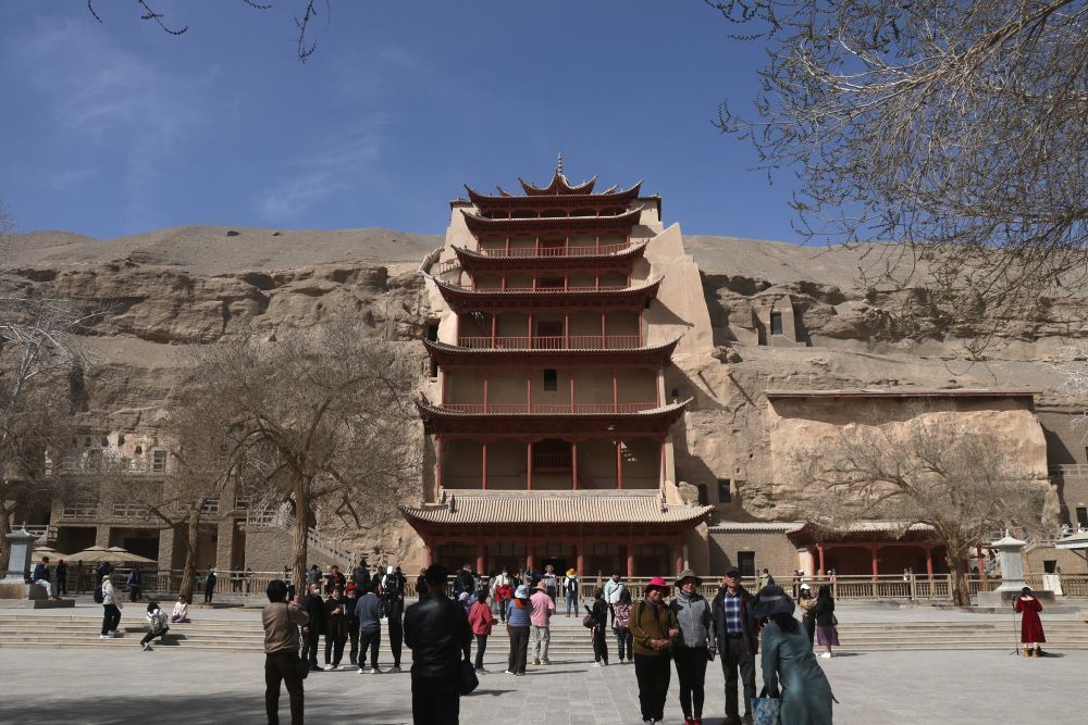 2024年3月31日,游客在世界文化遗产甘肃敦煌莫高窟参观游览。