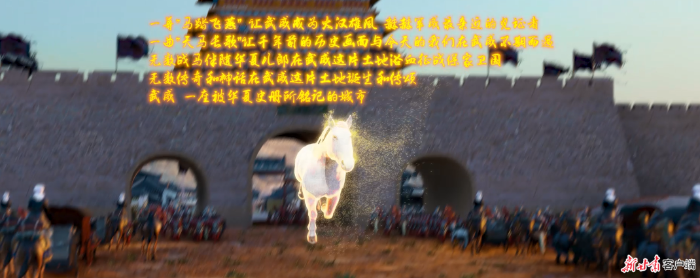 《天马长歌》通过一幅徐徐展开的山川画卷,引领观众回到公元前的祁连山下,开始一段历史穿越之旅。影片从祁连山-古浪峡-乌鞘岭-石羊河水系-武威绿洲的地理顺序展开,从公元前2世纪,回溯千年岁月,让观众感受金戈铁马、大漠孤烟的壮阔景象,聆听号角连天、战鼓彻野的激昂声音。