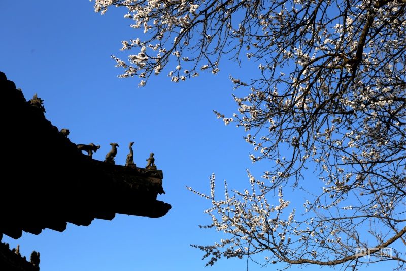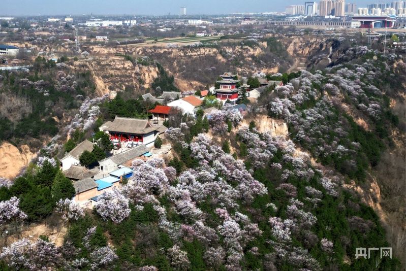 西峰区小崆峒景区古庙与杏花遥相呼应(央广网发 盘小美 摄)