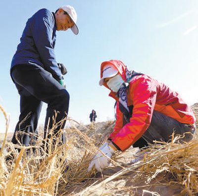 甘肃省张掖市高台县,志愿者在扎草方格沙障。