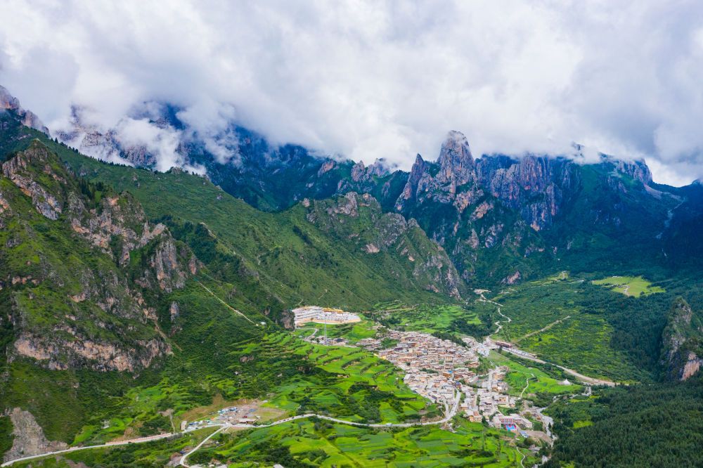△群山环抱的扎尕那美丽风光(无人机照片)。新华社记者 郎兵兵 摄