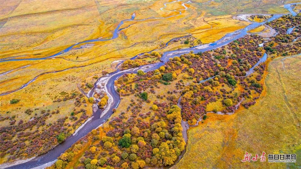 △秋日的阿万仓湿地景区,金黄色的湿地一望无际,支流如飘带般蜿蜒其间,尽显秀美之色。新甘肃·甘肃日报记者 丁凯