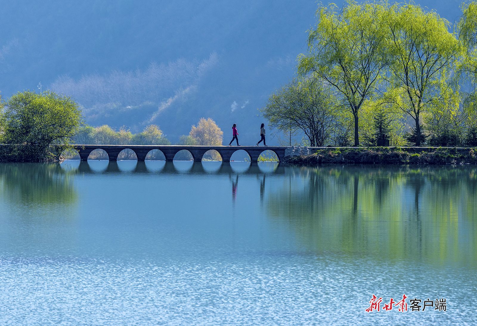 △清明节前后,陇南宕昌县国家4A级景区官鹅沟天气回暖,阴坪湖畔绿柳成荫,湖面碧绿如镜。新甘肃·甘肃日报通讯员 胡卫东