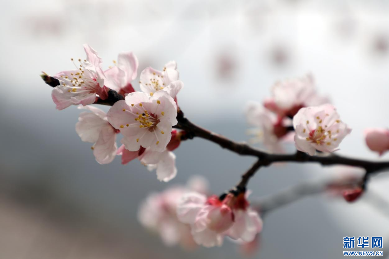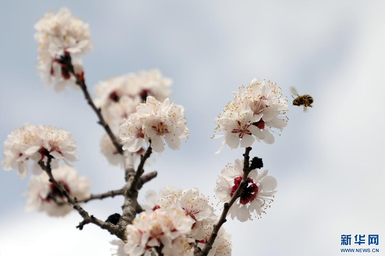 蜜蜂在杏花间采蜜。新华网发(童张伟 摄)