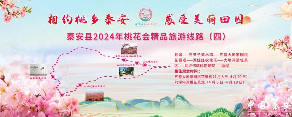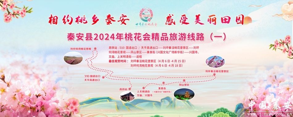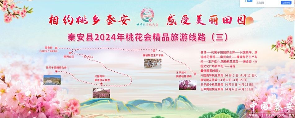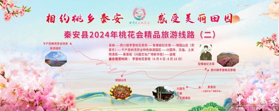 此外,秦安县文旅部门现场推出了四条赏桃花路线。分别是:高铁站、310国道出口、天平高速出口——刘坪秦洼桃花堡景区——刘坪何湾桃花景观——凤山景区——美食街(兴国文化广场新华街)——兴国寺、文庙、上关明清街;县城——西川镇李堡桃花景观——安维峻纪念馆——晓园山庄(农家乐)——千户杏树湾农业特色旅游园区——兴国寺、文庙、上关明清街——美食街(兴国文化广场新华街);县城——花篅子田园综合体——兴国高坪、康湾桃花景观——南苑山庄——康坡陶艺生产车间——王尹成小、陶杨桃花景观——美食街(兴国文化广场新华街);县城——石节子美术馆——五营大地家园桃花景观——泥娃娃农家乐——大地湾遗址景区——刘坪何湾桃花景观。