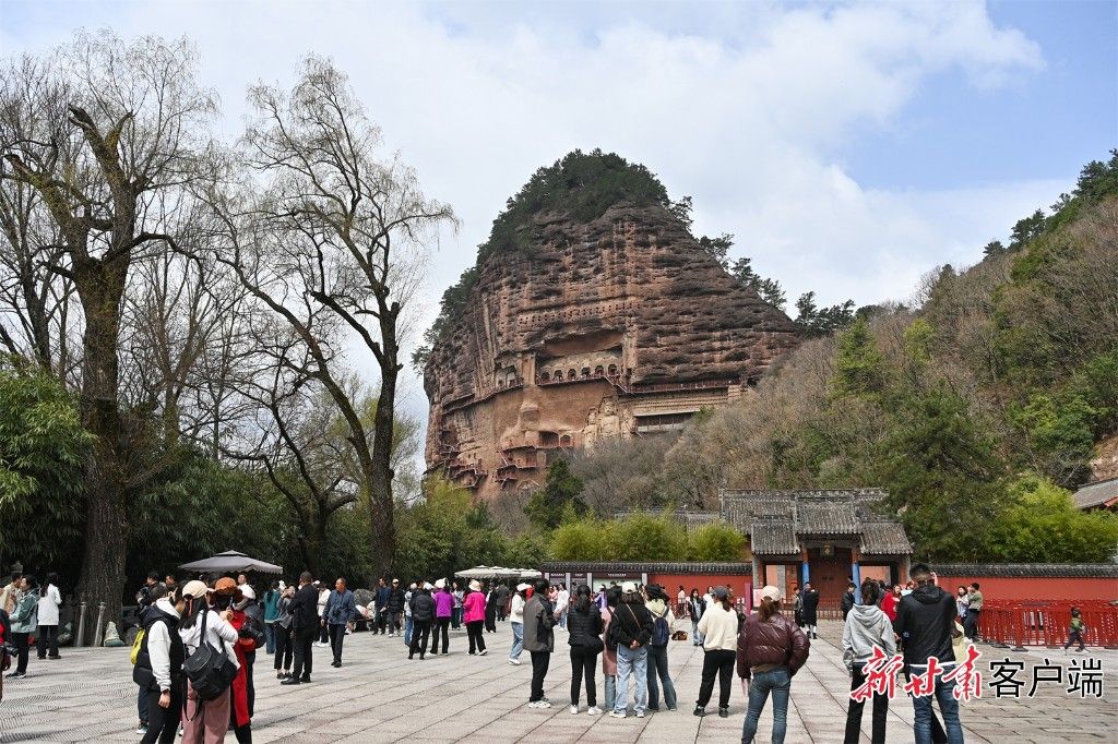 游客在麦积山石窟参观游览。