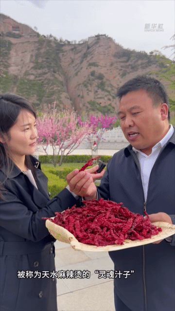 甘谷辣椒可以说是天水麻辣烫“吸粉”的制胜法宝。甘谷县文旅局局长手捧辣椒喊话全国网友,带大家一起来体验甘谷辣椒的独特魅力。