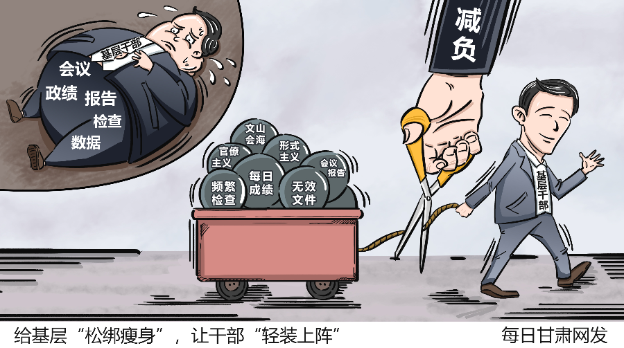 为基层减负关键在一个“实”字,要看有没有解决实际问题、群众的评价怎么样,要让基层干部有更多时间和精力服务群众。结合具体工作实际,要真减负、减真负,首先应该树立正确政绩观,坚决防止“拍脑袋决策”,杜绝“政绩工程”“面子工程”“新形象工程”。其次要建立为基层减负长效机制,各地各部门切实履行主体责任,统筹协调推进落实,确保出台的各项措施落到实处。最后要优化考核评价体系,突出察民情、看实绩、比实效,轻痕迹管理,形成良好结果导向。只有给基层“松绑瘦身”,让干部“轻装上阵”,才能提质增效,更好服务人民。(文字:李婧/漫画:滕嘉楷)